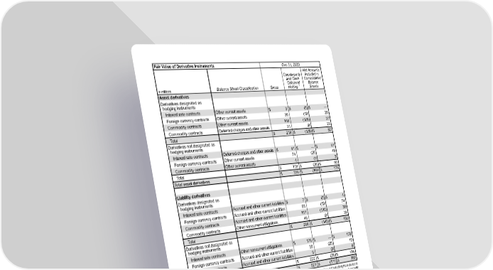 Fair Value of Derivative Instruments Dec 31, 2020 In millions Balance Sheet Classification Gross Counterparty and Cash Collateral Netting 1 Net Amounts Included in Consolidated Balance Sheets Asset derivatives Derivatives designated as hedging instruments Interest rate contracts Other current assets $ 3 $ (3) $ — Foreign currency contracts Other current assets 39 (19) 20 Commodity contracts Other current assets 146 (109) 37 Commodity contracts Deferred charges and other assets 31 (8) 23 Total $ 219 $ (139) $ 80 Derivatives not designated as hedging instruments Interest rate contracts Deferred charges and other assets $ 41 $ — $ 41 Foreign currency contracts Other current assets 74 (25) 49 Commodity contracts Other current assets 4 (1) 3 Total $ 119 $ (26) $ 93 Total asset derivatives $ 338 $ (165) $ 173 Liability derivatives Derivatives designated as hedging instruments Interest rate contracts Accrued and other current liabilities $ 7 $ (3) $ 4 Foreign currency contracts Accrued and other current liabilities 93 (19) 74 Commodity contracts Accrued and other current liabilities 151 (112) 39 Commodity contracts Other noncurrent obligations 48 (9) 39 Total $ 299 $ (143) $ 156 Derivatives not designated as hedging instruments Interest rate contracts Other noncurrent obligations $ 178 $ — $ 178 Foreign currency contracts Accrued and other current liabilities 35 (25) 10 Commodity contracts Accrued and other current liabilities 9 (3) 6 Total $ 222 $ (28) $ 194 Total liability derivatives $ 521 $ (171) $ 350 1. Counterparty and cash collateral amounts represent the estimated net settlement amount when applying netting and set-off rights included in master netting arrangements between the Company and its counterparties and the payable or receivable for cash collateral held or placed with the same counterparty. Assets and liabilities related to forward contracts, interest rate swaps, currency swaps, options and other conditional or exchange contracts executed with the same counterparty under a master netting arrangement are netted. Collateral accounts are netted with corresponding assets or liabilities, when applicable. The Company posted cash collateral of $71 million at December 31, 2021 ( $7 million at December 31, 2020 ). No cash collateral was posted by counterparties with the Company at December 31, 2021 and December 31, 2020 ). 145