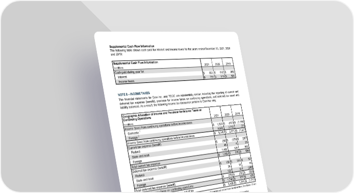 Supplemental Cash Flow Information The following table shows cash paid for interest and income taxes for the years ended December 31, 2021 , 2020 and 2019 : Supplemental Cash Flow Information 2021 2020 2019 In millions Cash paid during year for: Interest $ 801 $ 842 $ 993 Income taxes $ 731 $ 518 $ 881 NOTE 8 – INCOME TAXES The financial statements for Dow Inc. and TDCC are substantially similar, including the reporting of current and deferred tax expense (benefit), provision for income taxes on continuing operations, and deferred tax asset and liability balances. As a result, the following income tax discussion pertains to Dow Inc. only. Geographic Allocation of Income and Provision for Income Taxes on Continuing Operations In millions 2021 2020 2019 Income (loss) from continuing operations before income taxes Domestic 1 $ 1,523 $ (681) $ (1,196) Foreign 2 6,622 2,752 (51) Income (loss) from continuing operations before income taxes $ 8,145 $ 2,071 $ (1,247) Current tax expense (benefit) Federal $ (46) $ (176) $ (287) State and local 48 4 25 Foreign 1,460 691 960 Total current tax expense $ 1,462 $ 519 $ 698 Deferred tax expense (benefit) Federal $ 130 $ 184 $ 52 State and local 26 19 19 Foreign 122 55 (299) Total deferred tax expense (benefit) $ 278 $ 258 $ (228) Provision for income taxes on continuing operations $ 1,740 $ 777 $ 470 Income (loss) from continuing operations, net of tax $ 6,405 $ 1,294 $ (1,717) 1. The 2019 amount includes approximately $1.4 billion of expense related to goodwill impairment and environmental matters. See Notes 13 and 16 for additional information. 2. The 2019 amount includes approximately $1.8 billion of expense for Sadara related charges. See Note 12 for additional information. 99