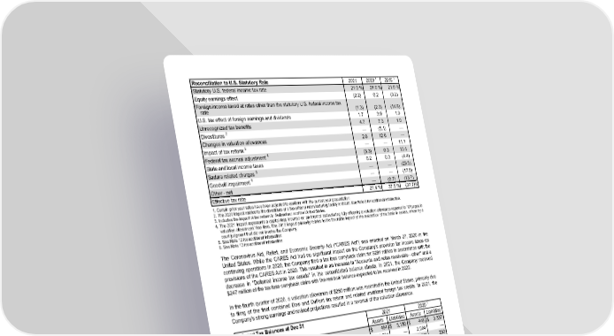 Reconciliation to U.S. Statutory Rate 2021 2020 1 2019 1 Statutory U.S. federal income tax rate 21.0 % 21.0 % 21.0 % Equity earnings effect (2.2) 0.2 (3.2) Foreign income taxed at rates other than the statutory U.S. federal income tax rate (1.3) (2.3) (14.8) U.S. tax effect of foreign earnings and dividends 1.7 3.9 1.9 Unrecognized tax benefits 4.7 7.3 1.0 Divestitures 2 — (5.1) — Changes in valuation allowances 2.6 12.6 — Impact of tax reform 3 — — 11.1 Federal tax accrual adjustment 4 (5.3) 0.3 10.4 State and local income taxes 0.2 0.3 (4.4) Sadara related charges 5 — — (29.5) Goodwill impairment 6 — — (17.5) Other - net — (0.7) (13.7) Effective tax rate 21.4 % 37.5 % (37.7) % 1. Certain prior year rates have been adjusted to conform with the current year presentation. 2. The 2020 impact relates to the divestiture of a bio-ethanol manufacturing facility in Brazil. See Note 6 for additional information. 3. Includes the impact of tax reform in Switzerland and the United States. 4. The 2021 impact represents a capital loss incurred on an internal restructuring fully offset by a valuation allowance reported in "Changes in valuation allowances" line item. The 2019 impact primarily relates to the favorable impact of the restoration of tax basis in assets, driven by a court judgment that did not involve the Company. 5. See Note 12 for additional information. 6. See Note 13 for additional information. The Coronavirus Aid, Relief, and Economic Security Act (“CARES Act”) was enacted on March 27, 2020 in the United States. While the CARES Act had no significant impact on the Company's provision for income taxes on continuing operations in 2020, the Company filed a tax loss carryback claim for $291 million in accordance with the provisions of the CARES Act in 2020. This resulted in an increase in "Accounts and notes receivable - other" and a decrease in "Deferred income tax assets" in the consolidated balance sheets. In 2021, the Company received $247 million of the tax loss carryback claim with the residual balance expected to be received in 2022. In the fourth quarter of 2020 , a valuation allowance of $260 million was recorded in the United States, primarily due to filing of the final combined Dow and DuPont tax return and related unutilized foreign tax credits. In 2021, the Company's strong earnings and revised projections resulted in a reversal of the valuation allowance. Deferred Tax Balances at Dec 31 2021 2020 1 In millions Assets Liabilities Assets Liabilities Property $ 484 $ 3,150 $ 448 $ 3,337 Tax loss and credit carryforwards 1,784 — 2,004 — Postretirement benefit obligations 1,753 303 2,712 250 Other accruals and reserves 1,487 191 1,542 78 Intangibles 108 556 124 638 Inventory 33 203 30 198 Investments 31 26 142 51 Other – net 1,093 101 858 196 Subtotal $ 6,773 $ 4,530 $ 7,860 $ 4,748 Valuation allowances (1,391) — (1,302) — Total $ 5,382 $ 4,530 $ 6,558 $ 4,748 1. Certain prior year balances have been adjusted to conform with the current year presentation. 100
