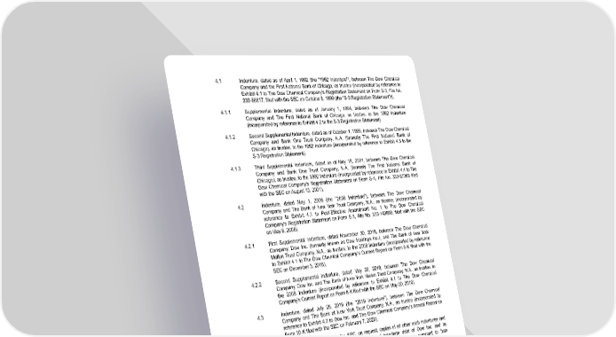 4.1 Indenture, dated as of April 1, 1992 (the "1992 Indenture"), between The Dow Chemical Company and the First National Bank of Chicago, as trustee (incorporated by reference to Exhibit 4.1 to The Dow Chemical Company's Registration Statement on Form S-3, File No. 333-88617, filed with the SEC on October 8, 1999 (the "S-3 Registration Statement")). 4.1.1 Supplemental Indenture, dated as of January 1, 1994, between The Dow Chemical Company and The First National Bank of Chicago, as trustee, to the 1992 Indenture (incorporated by reference to Exhibit 4.2 to the S-3 Registration Statement). 4.1.2 Second Supplemental Indenture, dated as of October 1, 1999, between The Dow Chemical Company and Bank One Trust Company, N.A. (formerly The First National Bank of Chicago), as trustee, to the 1992 Indenture (incorporated by reference to Exhibit 4.3 to the S-3 Registration Statement). 4.1.3 Third Supplemental Indenture, dated as of May 15, 2001, between The Dow Chemical Company and Bank One Trust Company, N.A. (formerly The First National Bank of Chicago), as trustee, to the 1992 Indenture (incorporated by reference to Exhibit 4.4 to The Dow Chemical Company's Registration Statement on Form S-4, File No. 333-67368 filed with the SEC on August 13, 2001). 4.2 Indenture, dated May 1, 2008 (the "2008 Indenture"), between The Dow Chemical Company and The Bank of New York Trust Company, N.A., as trustee, (incorporated by reference to Exhibit 4.1 to Post-Effective Amendment No. 1 to The Dow Chemical Company's Registration Statement on Form S-3, File No. 333-140859, filed with the SEC on May 6, 2008). 4.2.1 First Supplemental Indenture, dated November 30, 2018, between The Dow Chemical Company, Dow Inc. (formerly known as Dow Holdings Inc.), and The Bank of New York Mellon Trust Company, N.A., as trustee, to the 2008 Indenture (incorporated by reference t o E x h i b i t 4 . 1 t o T h e D o w C h e m i c a l C o m p a n y ' s C u r r e n t R e p o r t o n F o r m 8 ‑ K f i l e d w i t h t h e SEC on December 3, 2018). 4.2.2 Second Supplemental Indenture, dated May 20, 2019, between The Dow Chemical Company, Dow Inc. and The Bank of New York Mellon Trust Company, N.A., as trustee, to the 2008 Indenture (incorporated by reference to Exhibit 4.1 to The Dow Chemical Company's Current Report on Form 8-K filed with the SEC on May 20, 2019). 4.3 Indenture, dated July 26, 2019 (the "2019 Indenture"), between The Dow Chemical Company and The Bank of New York Trust Company, N.A., as trustee (incorporated by reference to Exhibit 4.3 to Dow Inc. and The Dow Chemical Company's Annual Report on Form 10-K filed with the SEC on February 7, 2020). 4.4 Dow Inc. agrees to provide the SEC, on request, copies of all other such indentures and instruments that define the rights of holders of long-term debt of Dow Inc. and its consolidated subsidiaries, including The Dow Chemical Company, pursuant to Item 601(b)(4)(iii)(A) of Regulation S-K. 4.5 Description of Securities registered under Section 12 of the Securities Exchange Act of 1934 (incorporated by reference to Exhibit 4.5 to Dow Inc. and The Dow Chemical Company's Current Report on Form 8-K filed with the SEC on February 3, 2022). 10.1 Tax Matters Agreement, effective as of April 1, 2019, by and among Dow Inc., DuPont de Nemours, Inc. (formerly known as DowDuPont Inc.), and Corteva Inc. (incorporated by reference to Exhibit 10.1 to Dow Inc.'s Current Report on Form 8-K filed with the SEC on April 2, 2019). 10.2 Employee Matters Agreement, effective as of April 1, 2019, by and among Dow Inc., DuPont de Nemours, Inc. (formerly known as DowDuPont Inc.), and Corteva, Inc. (incorporated by reference to Exhibit 10.2 to Dow Inc.'s Current Report on Form 8-K filed with the SEC on April 2, 2019). 164