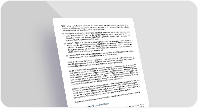 TDCC’s primary, private credit agreements also contain certain customary restrictive covenant and default provisions in addition to the covenants set forth above with respect to TDCC’s debt. Significant other restrictive covenants and default provisions related to these agreements include: (a) the obligation to maintain the ratio of TDCC’s consolidated indebtedness to consolidated capitalization at no greater than 0.70 to 1.00 at any time the aggregate outstanding amount of loans under the Five Year Competitive Advance and Revolving Credit Facility Agreement ("Revolving Credit Agreement") dated November 23, 2021, equals or exceeds $500 million , (b) a default if TDCC or an applicable subsidiary fails to make any payment, including principal, premium or interest, under the applicable agreement on other indebtedness of, or guaranteed by, TDCC or such applicable subsidiary in an aggregate amount of $100 million or more when due, or any other default or other event under the applicable agreement with respect to such indebtedness occurs which permits or results in the acceleration of $400 million or more in the aggregate of principal, and (c) a default if TDCC or any applicable subsidiary fails to discharge or stay within 60 days after the entry of a final judgment against TDCC or such applicable subsidiary of more than $400 million . Failure of TDCC to comply with any of the covenants or default provisions could result in a default under the applicable credit agreement which would allow the lenders to not fund future loan requests and to accelerate the due date of the outstanding principal and accrued interest on any outstanding indebtedness. On April 1, 2019, DowDuPont completed the separation of its materials science business and Dow Inc. became the direct parent company of TDCC. In conjunction with the separation, Dow Inc. is obligated, substantially concurrently with the issuance of any guarantee in respect of outstanding or committed indebtedness under TDCC's Revolving Credit Agreement, to enter into a supplemental indenture with TDCC and the trustee under TDCC’s existing 2008 base indenture governing certain notes issued by TDCC. Under such supplemental indenture, Dow Inc. will guarantee all outstanding debt securities and all amounts due under such existing base indenture and will become subject to certain covenants and events of default under the existing base indenture. In addition, the Revolving Credit Agreement includes an event of default which would be triggered in the event Dow Inc. incurs or guarantees third party indebtedness for borrowed money in excess of $250 million or engages in any material activity or directly owns any material assets, in each case, subject to certain conditions and exceptions. Dow Inc. may, at its option, cure the event of default by delivering an unconditional and irrevocable guarantee to the administrative agent within thirty days of the event or events giving rise to such event of default. No such events have occurred or have been triggered at the time of the filing of this Annual Report on Form 10-K. NOTE 16 – COMMITMENTS AND CONTING ENCIES Environmental Matters Introduction Accruals for environmental matters are recorded when it is probable that a liability has been incurred and the amount of the liability can be reasonably estimated based on current law and existing technologies. At December 31, 2021 , the Company had accrued obligations of $1,220 million for probable environmental remediation and restoration costs ( $1,244 million at December 31, 2020 ), including $237 million for the remediation of Superfund sites ( $248 million at December 31, 2020 ). This is management’s best estimate of the costs for remediation and restoration with respect to environmental matters for which the Company has accrued liabilities, although it is reasonably possible that the ultimate cost with respect to these particular matters could range up to approximately two times that amount. Consequently, it is reasonably possible that environmental remediation and restoration costs in excess of amounts accrued could have a material impact on the Company’s results of operations, financial condition and cash flows. It is the opinion of the Company’s management, however, that the possibility is remote that costs in excess of the range disclosed will have a material impact on the Company’s results of operations, financial condition or cash flows. Inherent uncertainties exist in these estimates primarily due to unknown conditions, changing governmental regulations and legal standards regarding liability, and emerging remediation technologies for handling site remediation and restoration. As new or additional information becomes available and/or certain spending trends become known, management will evaluate such information in determination of the current estimate of the environmental liability. 112