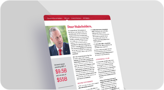 Dear Stakeholders, As we approach our 125th anniversary in May this year, I can’t help but reflect on the incredible journey that has made Dow the company we are today: an industry leader with global scale and an advantaged portfolio delivering sustainable solutions that enable us to tackle some of the world’s greatest challenges. The increasing demand for sustainable, low-carbon and circular products presents a compelling business opportunity for Dow, one we are capitalizing on as we advance our strategy to decarbonize our footprint, grow earnings, and further enhance value for all our stakeholders. 2021 was a monumental year for Team Dow. We proved resilient amidst continued uncertainty from the COVID-19 pandemic and weather-related disruptions that impacted our industry and broader economies around the globe. We overcame these challenges to deliver strong financial and operating performance, while continuing to advance our ambition and maintaining the well-being and safety of our team and communities. I am tremendously proud of Team Dow’s dedication and hard work to continuously deliver for our customers and drive value for our shareholders. RECORD PERFORMANCE In 2021, our strong execution resulted in record sales and earnings performance . We delivered net income of $6.4 billion and GAAP earnings per share was $8.38. Our ability to capture strong demand – coupled with tight supply/demand balances – supported net sales of $55 billion, up 43% year-over-year, with gains across every region and operating segment. Our continued focus on cost management and operating discipline also drove operating EBIT of $9.5 billion, up $6.8 billion, and operating EBIT margins expanded by 1,030 basis points to 17.3%. Cash flow from operations improved to $7.1 billion, which enabled us to execute on our balanced and disciplined capital allocation approach: • CapEx was $1.5 billion and r eturn on invested capital (ROIC) reached 22% as we continued to prioritize higher-return, lower-risk and faster-payback projects . • We further improved our strong balance sheet , reducing gross debt by $2.4 billion, achieving credit rating and outlook upgrades, and we now have no substantive debt maturities due until 2026. We also successfully reprofiled Sadara’s debt, resulting in greater than $2 billion in lower Sadara guarantees. • We returned $3.1 billion to shareholders , supported by $2.1 billion in dividends as well as $1 billion in share repurchases. In addition to these strong results, Team Dow remains well-positioned by our competitive advantages and through continued execution of our financial and operating playbook. A SUSTAINABLE FUTURE As we look ahead, one thing is clear: We are creating a more sustainable world. Protecting our environment is critical and will require sustainability commitments from both the public and private sectors to achieve the Paris Agreement targets. Environmental, social and governance (ESG) investing continues to accelerate, and consumers are increasingly demanding more sustainable products and solutions. At Dow, we have always been and will continue to be a leader in this sustainable world. Across our four market verticals – packaging, infrastructure, consumer and mobility – sustainability is a key driver of growth. We see our total addressable market expanding from $650 billion to over $800 billion as we build on our long history of sustainability and our innovative portfolio to solve many of the world’s biggest challenges, including waste reduction, improved energy efficiency, and safer, higher-performing, and more circular and sustainable consumer products. DECARBONIZE AND GROW EARNINGS Recognizing this opportunity, we laid out a pathway during our Investor Day in October 2021 to decarbonize our asset footprint and grow earnings , creating value for all stakeholders. 3 2021 | Dow Annual Report CEO Letter Corporate Governance 2021 Highlights Overview & Financial Highlights Delivered record operating EBIT of $9.5B and net sales of $55B Generated $ 7.1B of cash flow from operations Decreased gross debt by $2.4B