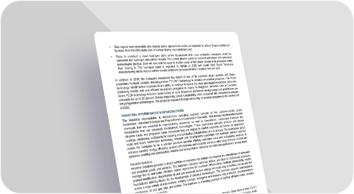 • Dow signed new renewable and cleaner power agreements which are expected to reduce Scope 2 emissions by more than 600,000 metric tons of carbon dioxide equivalent per year. • Plans to construct a clean hydrogen plant where by-products from core production processes would be converted into hydrogen and carbon dioxide. The carbon dioxide would be captured and stored until alternative technologies develop. Dow will also look for ways to enable usage of the carbon dioxide in its processes rather than storing it. The hydrogen plant is expected to startup in 2026 and would allow Dow's Terneuzen manufacturing site to reduce carbon dioxide emissions by approximately 1.4 million tons per year. In addition, in 2019, the Company announced the retrofit of one of its Louisiana steam crackers with Dow’s proprietary fluidized catalytic dehydrogenation ("FCDh") technology to produce on-purpose propylene. The FCDh technology retrofit further improves Dow’s ability to continue to source the most advantaged feedstocks, while also producing reliable and cost-efficient on-purpose propylene to supply its integrated derivative units in Louisiana. Dow's FCDh technology reduces capital outlay by up to 40 percent and lowers energy usage and greenhouse gas emissions by up to 20 percent, thereby improving overall sustainability when compared with conventional propane dehydrogenation technologies. The project is expected to begin producing on-purpose propylene in the second half of 2022. INDUSTRIAL INTERMEDIATES & INFRASTRUCTURE The Industrial Intermediates & Infrastructure operating segment consists of two customer-centric global businesses - Industrial Solutions and Polyurethanes & Construction Chemicals - that develop important intermediate chemicals that are essential to manufacturing processes, as well as downstream, customized materials and formulations that use advanced development technologies. These businesses primarily produce and market ethylene oxide and propylene oxide derivatives that are aligned to market segments as diverse as appliances, coatings, electronics, surfactants for cleaning and sanitization, infrastructure and oil and gas. The businesses' global scale and reach, world-class technology, research and development capabilities and materials science expertise enable the Company to be a premier solutions provider offering customers value-add sustainable solutions to enhance comfort, energy efficiency, product effectiveness and durability across a wide range of home comfort and appliance, building and construction, mobility and transportation, adhesive and lubricant applications, among others. Industrial Solutions Industrial Solutions provides a broad portfolio of solutions that enable and improve the manufacture of consumer and industrial goods and services. The business’ solutions minimize friction and heat in mechanical processes; manage the oil and water interface; deliver ingredients for maximum effectiveness; facilitate dissolvability; enable product identification; decarbonize oil and gas products; reduce energy and water use in textiles; and provide the foundational building blocks for the development of chemical technologies. The business supports manufacturers across a large variety of end-markets, notably coatings, detergents and cleaners, crop protection, pharmaceuticals, electronics, oil and gas, inks and textiles. The business is a leading producer of purified ethylene oxide, ethylene amines and ethanol amines. Polyurethanes & Construction Chemicals Polyurethanes & Construction Chemicals consists of three businesses: Polyurethanes, Chlor-Alkali & Vinyl (“CAV”) and Construction Chemicals. The Polyurethanes business is the world’s largest producer of propylene oxide, propylene glycol and polyether polyols, and a leading producer of aromatic isocyanates and fully formulated polyurethane systems for rigid, semi-rigid and flexible foams, as well as coatings, adhesives, sealants, elastomers and composites that serve energy efficiency, consumer comfort, industrial and enhanced mobility market sectors. The CAV business provides chlorine and caustic soda supply and markets caustic soda, a valuable co-product of the chlor-alkali manufacturing process, and ethylene dichloride and vinyl chloride monomer. The CAV business' assets are predominantly in Western Europe and largely produce materials for internal consumption. The Construction Chemicals business provides cellulose ethers, redispersible latex powders, and acrylic emulsions used as key building blocks for differentiated building and construction materials across many market segments and applications ranging from roofing and flooring to gypsum-, cement-, concrete- and dispersion-based building materials. Both Polyurethanes and Construction Chemicals deliver more sustainable products aligned toward green building markets yielding reduced environmental impacts and lower product intensity compared to traditional offerings. 10