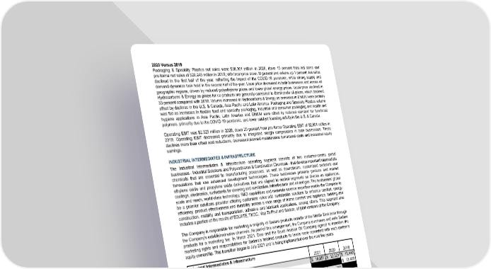2020 Versus 2019 Packaging & Specialty Plastics net sales were $18,301 million in 2020 , down 10 percent from net sales and pro forma net sales of $20,245 million in 2019 , with local price down 11 percent and volume up 1 percent. Net sales declined in the first half of the year, reflecting the impact of the COVID-19 pandemic, while strong supply and demand dynamics took hold in the second half of the year. Local price decreased in both businesses and across all geographic regions, driven by reduced polyethylene prices and lower global energy prices. Local price declined in Hydrocarbons & Energy as prices for co-products are generally correlated to Brent crude oil prices, which declined 33 percent compared with 2019 . Volume increased in Hydrocarbons & Energy as increases in EMEAI were partially offset by declines in the U.S. & Canada, Asia Pacific and Latin America. Packaging and Specialty Plastics volume was flat as increases in flexible food and specialty packaging, industrial and consumer packaging and health and hygiene applications in Asia Pacific, Latin America and EMEAI were offset by reduced demand for functional polymers, primarily due to the COVID-19 pandemic, and lower catalyst licensing activity in the U.S. & Canada. Operating EBIT was $2,325 million in 2020 , down 20 percent from pro forma Operating EBIT of $2,904 million in 2019 . Operating EBIT decreased primarily due to integrated margin compression in both businesses. These declines more than offset cost reductions, decreased planned maintenance turnaround costs and increased equity earnings. INDUSTRIAL INTERMEDIATES & INFRASTRUCTURE The Industrial Intermediates & Infrastructure operating segment consists of two customer-centric global businesses - Industrial Solutions and Polyurethanes & Construction Chemicals - that develop important intermediate chemicals that are essential to manufacturing processes, as well as downstream, customized materials and formulations that use advanced development technologies. These businesses primarily produce and market ethylene oxide and propylene oxide derivatives that are aligned to market segments as diverse as appliances, coatings, electronics, surfactants for cleaning and sanitization, infrastructure and oil and gas. The businesses' global scale and reach, world-class technology, R&D capabilities and materials science expertise enable the Company to be a premier solutions provider offering customers value-add sustainable solutions to enhance comfort, energy efficiency, product effectiveness and durability across a wide range of home comfort and appliance, building and construction, mobility and transportation, adhesive and lubricant applications, among others. This segment also includes a portion of the results of EQUATE, TKOC, Map Ta Phut and Sadara, all joint ventures of the Company. The Company is responsible for marketing a majority of Sadara products outside of the Middle East zone through the Company's established sales channels. As part of this arrangement, the Company purchases and sells Sadara products for a marketing fee. In March 2021, Dow and the Saudi Arabian Oil Company agreed to transition the marketing rights and responsibilities for Sadara’s finished products to levels more consistent with each partner’s equity ownership. This transition began in July 2021 and is being implemented over the next five years. Industrial Intermediates & Infrastructure In millions 2021 2020 2019 Net sales $ 16,851 $ 12,021 $ 13,440 Pro forma net sales $ 13,449 Operating EBIT $ 2,282 $ 355 Pro forma Operating EBIT $ 845 Equity earnings (losses) $ 471 $ (166) $ (241) 43