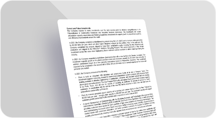 Current and Future Investments The Company expects to make investments over the next several years to enhance competitiveness in its Polyurethanes & Construction Chemicals and Industrial Solutions businesses. The investments will include alkoxylation capacity expansions and finishing capabilities; investments to support growth in polyurethane systems; and efficiency improvements around the world. In 2021, the Company completed a debottlenecking project along the U.S. Gulf Coast to increase aniline production by 60,000 tons per year, which will drive higher integrated margins for the portfolio. Also, in the past year, the Company completed key projects aligned to longer-term sustainability goals, including the first industrial-scale production unit aligned to the RENUVA™ Mattress Recycling Program. This project represents a fully circular investment across the value chain highlighting Dow’s materials science solutions to critical challenges facing the industry. In 2021, the Company expanded polyethylene glycol production with a new facility in St. Charles, Louisiana. This investment supports growth in the pharmaceutical market and increases capacity by 35 metric tons annually. In addition, construction began on a new specialty alkoxylation reactor in Plaquemine, Louisiana. This investment, expected to be completed in the second half of 2022, will add 60 metric tons of annual capacity for the home and personal care market. In 2021, the Company announced the following: • Plans to build an integrated MDI distillation and prepolymers facility at its site in Freeport, Texas. This investment supports increasing demand for downstream polyurethane systems products and advances Dow’s leading positions in attractive applications in construction, consumer, and industrial markets that are growing above gross domestic product. The new Freeport MDI facility will replace Dow’s current North America capacity in La Porte, Texas, and will also be capable of supplying an additional 30 percent of product to Dow’s customers. In coordination with the start-up of the new MDI facility expected in 2023, Dow will shut down its polyurethane assets at the La Porte site. • Plans to increase propylene glycol capacity at its existing joint venture facility in Map Ta Phut, Thailand by 80,000 tons per year – bringing total capacity to 250,000 tons per year. The additional capacity will support customer growth across Asia Pacific and India and is expected to come online in 2024. • A signed Memorandum of Understanding with the Zhanjiang Economic and Technological Development Zone Administrative Committee (Zhanjiang EDZ) to build the Dow South China Specialties Hub, a multi-year project providing customers local access to Dow’s portfolio of high value products and innovative technologies. The new manufacturing hub would extend Dow’s local reach, further enhancing supply reliability, responsiveness to market needs and customized innovation, and better positions customers for success in markets including mobility, pharmaceuticals, cleaning chemicals, apparel, home and personal care, lubricants and adhesives. • Dow and Ralph Lauren Corporation released a detailed manual on how to dye cotton more sustainably and more effectively than ever before using ECOFAST™ Pure Sustainable Textile Treatment. Pretreating fabric with ECOFAST™ Pure helps significantly reduce the amount of water, chemicals and energy needed to color cotton, by enabling up to 90 percent less process chemicals, 50 percent less water, 50 percent less dyes and 40 percent less energy without sacrificing color or quality. • Dow and Orion Chemicals Orgaform together with Eco-mobilier, H&S Anlagentechnik and The Vita Group have inaugurated a pioneering mattress recycling plant as part of the RENUVA™ program. This is a major step forward for the recovery and recycling of polyurethane foam and a significant advancement to close the loop for end-of-life mattresses. At full capacity the plant will process up to 200,000 mattresses per year to address growing mattress waste. 12