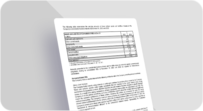 The following table summarizes the carrying amounts of these entities’ assets and liabilities included in the Company’s consolidated balance sheets at December 31, 2021 and 2020 : Assets and Liabilities of Consolidated VIEs at Dec 31 In millions 2021 2020 Cash and cash equivalents $ 40 $ 26 Other current assets 40 44 Net property 184 232 Other noncurrent assets 15 17 Total assets 1 $ 279 $ 319 Current liabilities $ 37 $ 73 Long-term debt 3 6 Other noncurrent obligations 13 18 Total liabilities 2 $ 53 $ 97 1. All assets were restricted at December 31, 2021 and 2020 . 2. All liabilities were nonrecourse at December 31, 2021 and 2020 . Amounts presented in the consolidated balance sheets and the table above as restricted assets or nonrecourse obligations relating to consolidated VIEs at December 31, 2021 and 2020 are adjusted for intercompany eliminations. Nonconsolidated VIEs The Company holds a variable interest in the following entities for which the Company is not the primary beneficiary: Silicon Joint Ventures The Company holds minority voting interests in certain joint ventures that produce silicon inputs for the Company. These joint ventures operate under supply agreements that sell inventory to the equity owners using pricing mechanisms that guarantee a return, therefore shielding the joint ventures from the obligation to absorb expected losses. As a result of the pricing mechanisms of these agreements, these entities are determined to be VIEs. The Company is not the primary beneficiary, as it does not hold the power to direct the activities that most significantly impact the economic performance of these entities; therefore, the entities are accounted for under the equity method of accounting. The Company's maximum exposure to loss as a result of its involvement with these variable interest entities is determined to be the carrying value of the investment in these entities. At December 31, 2021 , the Company's investment in these joint ventures was $110 million ( $107 million at December 31, 2020 ), classified as "Investment in nonconsolidated affiliates" in the consolidated balance sheets, representing the Company's maximum exposure to loss. NOTE 25 – RELATED PARTY TRANSACTIONS Effective with the separation from DowDuPont on April 1, 2019, TDCC became a wholly owned subsidiary of Dow Inc. and reported transactions with Dow Inc. as related party transactions. From the Merger Date through March 31, 2019, TDCC reported transactions with DowDuPont and Historical DuPont and its affiliates as related party transactions. TDCC TDCC has committed to fund Dow Inc.'s dividends paid to common stockholders and share repurchases, as approved by Dow Inc.'s Board from time to time, as well as certain governance expenses. Funding is accomplished through intercompany loans. TDCC's Board reviews and determines a dividend distribution to Dow Inc. to settle the intercompany loans. T he following table summarizes cash dividends TDCC declared and paid to Dow Inc. for the years ended 2021 , 2020 and 2019 . TDCC Cash Dividends Declared and Paid 2021 2020 2019 In millions Cash dividends declared and paid $ 3,264 $ 2,233 $ 201 At December 31, 2021 and 2020 , TDCC's intercompany loan balance with Dow Inc. was insignificant. 151