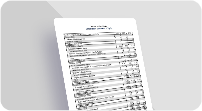 Dow Inc. and Subsidiaries Consolidated Statements of Equity (In millions, except per share amounts) For the years ended Dec 31, 2021 2020 2019 Common Stock Balance at beginning of year $ 8 $ 8 $ — Common stock issued — — 8 Balance at end of year 8 8 8 Additional Paid-in Capital Balance at beginning of year 7,595 7,325 7,042 Common stock issued / sold 320 108 57 Issuance of parent company stock - DowDuPont Inc. — — 28 Stock-based compensation and allocation of ESOP shares 236 162 235 Other — — (37) Balance at end of year 8,151 7,595 7,325 Retained Earnings Balance at beginning of year 16,361 17,045 35,460 Net income (loss) available for Dow Inc.'s common stockholders 6,311 1,225 (1,359) Dividends to stockholders (2,073) (2,071) (1,550) Dividends to DowDuPont Inc. — — (535) Common control transaction 46 177 (14,806) Adoption of accounting standards — — (151) Other (22) (15) (14) Balance at end of year 20,623 16,361 17,045 Accumulated Other Comprehensive Loss Balance at beginning of year (10,855) (10,246) (9,885) Other comprehensive income (loss) 1,878 (609) (1,154) Common control transaction — — 793 Balance at end of year (8,977) (10,855) (10,246) Unearned ESOP Shares Balance at beginning of year (49) (91) (134) Stock-based compensation and allocation of ESOP shares 34 42 45 ESOP shares acquired — — (2) Balance at end of year (15) (49) (91) Treasury Stock Balance at beginning of year (625) (500) — Treasury stock purchases (1,000) (125) (500) Balance at end of year (1,625) (625) (500) Dow Inc.'s stockholders' equity 18,165 12,435 13,541 Noncontrolling Interests 574 570 553 Total Equity $ 18,739 $ 13,005 $ 14,094 Dividends declared per share of common stock $ 2.80 $ 2.80 $ 2.10 See Notes to the Consolidated Financial Statements. 77