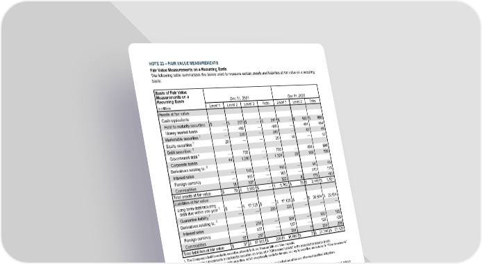 NOTE 23 – FAIR VALUE MEASUREMENTS Fair Value Measurements on a Recurring Basis The following table summarizes the bases used to measure certain assets and liabilities at fair value on a recurring basis: Basis of Fair Value Measurements on a Recurring Basis Dec 31, 2021 Dec 31, 2020 In millions Level 1 Level 2 Level 3 Total Level 1 Level 2 Total Assets at fair value: Cash equivalents: Held-to-maturity securities 1 $ — $ 317 $ — $ 317 $ — $ 980 $ 980 Money market funds — 489 — 489 — 484 484 Marketable securities 2 — 245 — 245 — 45 45 Equity securities 3 20 — — 20 40 — 40 Debt securities: 3 Government debt 4 — 735 — 735 — 698 698 Corporate bonds 44 1,280 — 1,324 28 908 936 Derivatives relating to: 5 Interest rates — 145 — 145 — 44 44 Foreign currency — 165 — 165 — 113 113 Commodities 15 307 — 322 8 173 181 Total assets at fair value $ 79 $ 3,683 $ — $ 3,762 $ 76 $ 3,445 $ 3,521 Liabilities at fair value: Long-term debt including debt due within one year 6 $ — $ 17,125 $ — $ 17,125 $ — $ 20,604 $ 20,604 Guarantee liability 7 — — 220 220 — — — Derivatives relating to: 5 Interest rates — 284 — 284 — 185 185 Foreign currency — 137 — 137 — 128 128 Commodities 37 257 — 294 7 201 208 Total liabilities at fair value $ 37 $ 17,803 $ 220 $ 18,060 $ 7 $ 21,118 $ 21,125 1. The Company's held-to-maturity securities primarily included treasury bills and time deposits. 2. The Company's investments in marketable securities are included in "Other current assets" in the consolidated balance sheets. 3. The Company's investments in debt securities, which are primarily available-for-sale, and equity securities are included in "Other investments" in the consolidated balance sheets. 4. U.S. Treasury obligations, U.S. agency obligations, U.S. agency mortgage-backed securities and other municipalities' obligations. 5. See Note 22 for the classification of derivatives in the consolidated balance sheets. 6. See Note 22 for information on fair value measurements of long-term debt. 7. Estimated liability for TDCC's guarantee of Sadara's debt which is included in "Other noncurrent obligations" in the consolidated balance sheets. See Note 16 for additional information. For assets and liabilities classified as Level 1 measurements (measured using quoted prices in active markets), total fair value is either the price of the most recent trade at the time of the market close or the official close price, as defined by the exchange on which the asset is most actively traded on the last trading day of the period, multiplied by the number of units held without consideration of transaction costs. For assets and liabilities classified as Level 2 measurements, where the security is frequently traded in less active markets, fair value is based on the closing price at the end of the period; where the security is less frequently traded, fair value is based on the price a dealer would pay for the security or similar securities, adjusted for any terms specific to that asset or liability, or by using observable market data points of similar, more liquid securities to imply the price. Market inputs are obtained from well-established and recognized vendors of market data and subjected to tolerance and quality checks. 147
