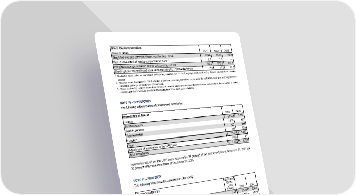 Share Count Information 2021 2020 2019 Shares in millions Weighted-average common shares outstanding - basic 743.6 740.5 742.5 Plus dilutive effect of equity compensation plans 2 5.4 1.8 — Weighted-average common shares outstanding - diluted 2 749.0 742.3 742.5 Stock options and restricted stock units excluded from EPS calculations 3 5.8 14.2 20.8 1. Restricted stock units are considered participating securities due to the Company's practice of paying dividend equivalents on unvested shares. 2. The year ended December 31, 2019 reflected a loss from continuing operations, and as such, the basic share count was used for purposes of calculating earnings per share on a diluted basis. 3. These outstanding options to purchase shares of common stock and restricted stock units were excluded from the calculation of diluted earnings per share because the effect of including them would have been antidilutive. NOTE 10 – INVENTORIES The following table provides a breakdown of inventories: Inventories at Dec 31 In millions 2021 2020 Finished goods $ 4,554 $ 3,140 Work in process 1,615 996 Raw materials 822 598 Supplies 866 933 Total $ 7,857 $ 5,667 Adjustment of inventories to the LIFO basis (485) 34 Total inventories $ 7,372 $ 5,701 Inventories valued on the LIFO basis represented 27 percent of the total inventories at December 31, 2021 and 30 percen t of the total inventories at December 31, 2020 . NOTE 11 – PROPERTY The following table provides a breakdown of property: Property at Dec 31 Estimated Useful Lives (Years) 2021 2020 In millions Land and land improvements 0 - 25 $ 2,045 $ 2,011 Buildings 5 - 50 5,108 4,976 Machinery and equipment 3 - 25 42,627 42,108 Other property 3 - 50 6,286 5,626 Construction in progress — 1,538 1,604 Total property $ 57,604 $ 56,325 In millions 2021 2020 2019 Depreciation expense $ 2,063 $ 2,092 $ 2,156 Capitalized interest $ 59 $ 64 $ 80 103