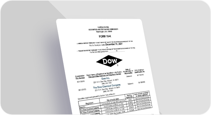 UNITED STATES SECURITIES AND EXCHANGE COMMISSION Washington, D.C. 20549 FORM 10-K ☑ ANNUAL REPORT PURSUANT TO SECTION 13 OR 15(d) OF THE SECURITIES EXCHANGE ACT OF 1934 For the fiscal year ended December 31, 2021 or ☐ TRANSITION REPORT PURSUANT TO SECTION 13 OR 15(d) OF THE SECURITIES EXCHANGE ACT OF 1934 For the transition period from __________to__________ Commission File Number Exact Name of Registrant as Specified in its Charter, Principal Office Address and Telephone Number State of Incorporation or Organization I.R.S. Employer Identification No. 001-38646 Dow Inc. Delaware 30-1128146 2211 H.H. Dow Way , Midland , MI 48674 ( 989 ) 636-1000 001-03433 The Dow Chemical Company Delaware 38-1285128 2211 H.H. Dow Way , Midland , MI 48674 ( 989 ) 636-1000 Securities registered pursuant to Section 12(b) of the Act: Registrant Title of each class Trading Symbol(s) Name of each exchange on which registered Dow Inc. Common Stock, par value $0.01 per share DOW New York Stock Exchange The Dow Chemical Company 0.500% Notes due March 15, 2027 DOW/27 New York Stock Exchange The Dow Chemical Company 1.125% Notes due March 15, 2032 DOW/32 New York Stock Exchange The Dow Chemical Company 1.875% Notes due March 15, 2040 DOW/40 New York Stock Exchange The Dow Chemical Company 4.625% Notes due October 1, 2044 DOW/44 New York Stock Exchange Securities registered pursuant to Section 12(g) of the Act: None Indicate by check mark if the registrant is a well-known seasoned issuer, as defined in Rule 405 of the Securities Act. Dow Inc. ☑ Yes ☐ No The Dow Chemical Company ☑ Yes ☐ No Indicate by check mark if the registrant is not required to file reports pursuant to Section 13 or Section 15(d) of the Act. Dow Inc. ☐ Yes ☑ No The Dow Chemical Company ☐ Yes ☑ No Indicate by check mark whether the registrant (1) has filed all reports required to be filed by Section 13 or 15(d) of the Securities Exchange Act of 1934 during the preceding 12 months (or for such shorter period that the registrant was required to file such reports), and (2) has been subject to such filing requirements for the past 90 days. Dow Inc. ☑ Yes ☐ No The Dow Chemical Company ☑ Yes ☐ No