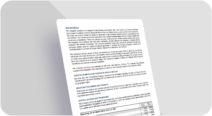 RAW MATERIALS The Company operates in an integrated manufacturing environment. Basic raw materials are processed through many stages to produce a number of products that are sold as finished goods at various points in those processes. The major raw material stream that feeds the production of the Company's finished goods is hydrocarbon-based raw materials. The Company purchases hydrocarbon raw materials including ethane, propane, butane, naphtha and condensate as feedstocks. These raw materials are used in the production of both saleable products and energy. The Company also purchases and sells certain monomers, primarily ethylene and propylene, to balance internal production and internal consumption. The Company purchases natural gas, primarily to generate electricity, and purchases electric power to supplement internal generation. In addition, the Company produces a portion of its electricity needs in Louisiana and Texas; Alberta, Canada; The Netherlands; and Germany. The Company's primary source of these raw materials are natural gas liquids ("NGLs"), which are derived from natural gas and crude oil production, and naphtha, which is produced during the processing and refining of crude oil. Given recent advancements in shale gas, shale oil and conventional drilling techniques, the Company expects these raw materials to be in abundant supply. The Company's suppliers of these raw materials include regional, international and national oil and gas companies. The Company purchases raw materials on both short- and long-term contracts. The Company had adequate supplies of raw materials in 2021 and expects to continue to have adequate supplies of raw materials in 2022 . INDUSTRY SEGMENTS AND GEOGRAPHIC REGION RESULTS See Note 26 to the Consolidated Financial Statements for information regarding net sales, pro forma net sales, Operating EBIT, pro forma Operating EBIT and total assets by segment, as well as net sales and long-lived assets by geographic region. SIGNIFICANT CUSTOMERS AND PRODUCTS All products and services are marketed primarily through the Company’s sales force, although in some instances more emphasis is placed on sales through distributors. In 2021 , no significant portion of the Company's sales was dependent upon a single customer. PATENTS, LICENSES AND TRADEMARKS The Company continually applies for and obtains U.S. and foreign patents and has a substantial number of pending patent applications throughout the world. At December 31, 2021 , the Company owned approximately 3,600 active U.S. patents and 21,300 active foreign patents as follows: Remaining Life of Patents Owned at Dec 31, 2021 United States Rest of World Within 5 years 700 3,800 6 to 10 years 1,200 7,400 11 to 15 years 1,500 9,500 16 to 20 years 200 600 Total 3,600 21,300 The Company’s primary purpose in obtaining patents is to protect the results of its research for use in operations and licensing. The Company is party to a substantial number of patent licenses, including intellectual property cross-license agreements and other technology agreements, and also has a substantial number of trademarks and trademark registrations in the United States and in other countries, including the “Dow in Diamond” trademark. Although the Company considers that its patents, licenses and trademarks in the aggregate constitute a valuable asset, it does not regard its business as being materially dependent on any single or group of related patents, licenses or trademarks. 15