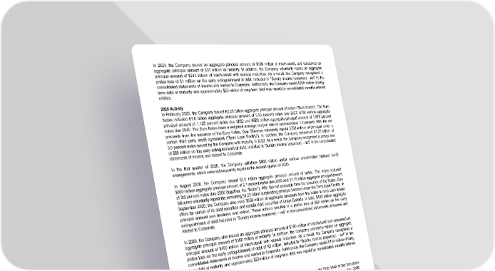 In 2021, the Company issued an aggregate principal amount of $109 million of InterNotes®, and redeemed an aggregate principal amount of $31 million at maturity. In addition, the Company voluntarily repaid an aggregate principal amount of $213 million of InterNotes® with various maturities. As a result, the Company recognized a pretax loss of $1 million on the early extinguishment of debt, included in "Sundry income (expense) - net" in the consolidated statements of income and related to Corporate. Additionally, the Company repaid $259 million of long- term debt at maturity and approximately $25 million of long-term debt was repaid by consolidated variable interest entities. 2020 Activity In February 2020, the Company issued €2.25 billion aggregate principal amount of notes (“Euro Notes”). The Euro Notes included €1.0 billion aggregate principal amount of 0.50 percent notes due 2027 , €750 million aggregate principal amount of 1.125 percent notes due 2032 and €500 million aggregate principal amount of 1.875 percent notes due 2040 . The Euro Notes have a weighted average coupon rate of approximately 1.0 percent . With the net proceeds from the issuance of the Euro Notes, Dow Silicones voluntarily repaid $750 million of principal under a certain third party credit agreement ("Term Loan Facility”). In addition, the Company redeemed $1.25 billion of 3.0 percent notes issued by the Company with maturity in 2022 . As a result, the Company recognized a pretax loss of $85 million on the early extinguishment of debt, included in “Sundry income (expense) – net” in the consolidated statements of income and related to Corporate. In the first quarter of 2020, the Company withdrew $800 million under various uncommitted bilateral credit arrangements, which were subsequently repaid in the second quarter of 2020. In August 2020, the Company issued $2.0 billion aggregate principal amount of notes. The notes included $850 million aggregate principal amount of 2.1 percent notes due 2030 and $1.15 billion aggregate principal amount of 3.6 percent notes due 2050 (together, the "Notes" ). With the net proceeds from the issuance of the Notes, Dow Silicones voluntarily repaid the remaining $1.25 billion outstanding principal balance under the Term Loan Facility. In September 2020, the Company also used $556 million of aggregate proceeds from the Notes to fund cash tender offers for certain of its debt securities and certain debt securities of Union Carbide. In total, $493 million aggregate principal amount was tendered and retired. These actions resulted in a pretax loss of $62 million on the early extinguishment of debt included in "Sundry income (expense) – net" in the consolidated statements of income and related to Corporate. In 2020, the Company also issued an aggregate principal amount of $190 million of InterNotes® and redeemed an aggregate principal amount of $180 million at maturity. In addition, the Company voluntarily repaid an aggregate principal amount of $400 million of InterNotes® with various maturities. As a result, the Company recognized a pretax loss on the early extinguishment of debt of $2 million , included in “Sundry income (expense) – net” in the consolidated statements of income and related to Corporate. Additionally, the Company repaid $134 million of long- term debt at maturity and approximately $29 million of long-term debt was repaid by consolidated variable interest entities. 2019 Activity In 2019, the Company issued $2 billion of senior unsecured notes in an offering under Rule 144A of the Securities Act of 1933. The offering included $750 million aggregate principal amount of 4.80 percent notes due 2049; $750 million aggregate principal amount of 3.625 percent notes due 2026; and $500 million aggregate principal amount of 3.15 percent notes due 2024. In addition, the Company redeemed $1.5 billion of 4.25 percent notes with maturity in 2020 and $1.25 billion of 4.125 percent notes with maturity in 2021. As a result, the Company recognized a pretax loss of $100 million on the early extinguishment of debt, included in "Sundry income (expense) - net" in the consolidated statements of income and related to Corporate. The Company also issued an aggregate principal amount of $277 million of InterNotes® and redeemed an aggregate principal amount of $122 million at maturity. Approximately $149 million of long-term debt (net of $16 million of issuances) was repaid by consolidated variable interest entities. In 2019, Dow Silicones voluntarily repaid $2.5 billion of principal under the Term Loan Facility. As a result, Dow Silicones recognized a pretax loss of $2 million on the early extinguishment of debt, included in "Sundry income (expense) - net" in the consolidated statements of income and related to Corporate. 110