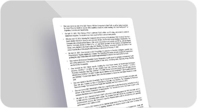 • Dow was named as one of the 2021 Fortune 100 Best Companies to Work For®; as well as, being recognized by Great Place to Work® in several other countries around the world including: 2021 Best Workplaces™ in Argentina, Colombia and Saudi Arabia. • On April 13, 2021, Fitch Ratings ("Fitch") reaffirmed TDCC’s BBB+ and F2 rating, and revised its outlook to stable from negative. The decision was made as part of Fitch’s annual review process. • Effective April 15, 2021, following the Company's Annual Meeting of Stockholders ("2021 Meeting") Dow Inc.'s Board elected Richard K. Davis to serve as Lead Director until the 2022 Annual Meeting of Stockholders. The Company also announced that Debra L. Dial, senior vice president and controller at AT&T Inc., and Luis Alberto Moreno, managing director at Allen & Co, LLC and former president of Inter-American Development Bank Group, were elected to the Board at the 2021 Meeting. Ajay Banga, Jacqueline K. Barton and James A. Bell retired from the Board following the 2021 Meeting as announced on February 11, 2021. • On April 21, 2021, Dow received a 2021 FutureEdge 50 award for its Predictive Intelligence capability, Dow Polyurethanes’ flagship digitalization initiative. The FutureEdge 50 awards annually recognize 50 organizations pushing the edge of innovation with breakthrough technologies to advance their business for the future. • Dow received 20 American Chemistry Council Responsible Care® awards for exemplary environmental, health and safety performance. Dow received awards for site safety, minimizing waste, improving energy efficiency, and its COVID-19 response. • Dow received six 2021 Edison Awards, including five Gold Edison Awards, for breakthrough technologies including: DOWSIL™ CC-8030 UV and Moisture Dual Cure Conformal Coating; DOWSIL™ TC-5515LT Thermally Conductive Gap Filler; DOWSIL™ TC-3065 Thermal Conductive Silicone Gel for 5G Optical Access Infrastructure; DOWSIL™ VE-8001 Flexible Silicone Adhesive by Dow; RHOBARR™ 320 Polyolefin Dispersion; and DOWSIL™ Crystal Clear Spacer. Dow is the first company to receive five Gold Edison Awards in a single year. • Dow was named to the 2021 DiversityInc Top 50 Companies for Diversity list for the fourth consecutive year. Dow was also included on three of DiversityInc's Specialty Lists including: Top Companies for Employee Resource Groups, Top Companies for People with Disabilities, and Top Companies for ESG. • Dow was named 2021 Manufacturer of the Year, Large Enterprise, by the Manufacturing Leadership Council, a division of the National Association of Manufacturers. The Manufacturer of the Year Award is given to the company that shows best-in-class achievement. • On June 10, 2021, Standard & Poor's ("S&P") announced a credit rating upgrade for TDCC from BBB- and A-3 to BBB and A-2, maintaining stable outlook. The decision from S&P reflects the expectation for an ongoing macroeconomic recovery, the Company’s supportive financial policies and the strengthening of its operating performance in 2021 relative to 2020. • Dow was named a 2021 honoree and the Materials Sector leader of The Civic 50 by Points of Light, the world’s largest organization committed to inspiring, equipping and engaging people to take action to change their communities and the world. • On June 24, 2021, Dow Inc. released “INtersections,” its first consolidated Environmental, Social and Governance ("ESG") Report highlighting the Company’s significant progress to fully integrate environmental stewardship and positive social impact throughout its operations, teams, supply chain and communities. This marked Dow's eighteenth year of voluntary reporting on sustainability. • For the fifth consecutive year, Dow has received a top score on the Disability Equality Index ®, placing the Company among the “Best Places to Work for Disability Inclusion” for 2021. • Dow received the “Best in Enterprise Resilience” certification from Everbridge as a part of their Critical Event Management (CEM) Certification™ Program. This recognition demonstrates Dow’s commitment to implementing best practices for enterprise resilience that keep employees safe and the company running safely, reliably and efficiently. • Dow was named to Seramount’s 2021 Inclusion Index (formerly known as the Diversity Best Practices Inclusion Index). This is the first year Dow was recognized on the list which includes a total of 45 organizations recognized for creating an inclusive workplace. • Dow was named one of the "2021 PEOPLE Companies that Care®" for the second consecutive year. 33