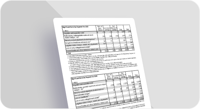 Significant Items by Segment for 2020 Pack. & Spec. Plastics Ind. Interm. & Infrast. Perf. Materials & Coatings Corp. Total In millions Integration and separation costs 1 $ — $ — $ — $ (239) $ (239) Restructuring, implementation costs and asset related charges - net 2 (30) (22) (192) (474) (718) Warranty accrual adjustment of exited business 3 — — — 11 11 Net gain on divestitures and asset sale 4 52 61 — 604 717 Litigation related charges, awards and adjustments 5 544 — — — 544 Loss on early extinguishment of debt 6 — — — (149) (149) Indemnification and other transaction related costs 7 — — — (21) (21) Total $ 566 $ 39 $ (192) $ (268) $ 145 1. Costs related to business separation activities. 2. Includes Board approved restructuring plans, including costs associated with implementing the Company's 2020 Restructuring Program, and asset-related charges, which include other asset impairments. See Note 6 for additional information. 3. Includes an adjustment to the warranty accrual of an exited business. 4. Primarily related to a gain on the sale of rail infrastructure in the U.S. and Canada and a gain on the sale of marine and terminal operations and assets in the U.S. See Notes 5 and 7 for additional information. 5. Includes recognition of gains associated with a legal matter with Nova. See Note 16 for additional information. 6. The Company retired outstanding long-term debt resulting in a loss on early extinguishment. See Note 15 for additional information. 7. Primarily related to charges associated with agreements entered into with DuPont and Corteva as part of the separation and distribution which, among other matters, provides for cross-indemnities and allocations of obligations and liabilities for periods prior to, at and after the completion of the separation. See Note 3 for additional information. Significant Items by Segment for 2019 Pack. & Spec. Plastics Ind. Interm. & Infrast. Perf. Materials & Coatings Corp. Total In millions Integration and separation costs 1 $ — $ — $ — $ (1,013) $ (1,013) Restructuring, goodwill impairment and asset related charges - net 2 (439) (1,175) (1,076) (529) (3,219) Warranty accrual adjustment of exited business 3 — — — 39 39 Environmental charges 4 (5) (8) (50) (336) (399) Loss on divestitures 5 — (5) — (44) (49) Loss on early extinguishment of debt 6 — — — (102) (102) Litigation related charges, awards and adjustments 7 170 — — 35 205 Indemnification and other transaction related costs 8 — — — (144) (144) Total $ (274) $ (1,188) $ (1,126) $ (2,094) $ (4,682) 1. Costs related to post-Merger integration and business separation activities. Excludes one-time transaction costs directly attributable to the Merger. 2. Includes Board approved restructuring plans and asset related charges (see Note 6 for additional information); a charge related to Sadara (see Note 12 for additional information) and an impairment charge related to goodwill associated with the Coatings & Performance Monomers reporting unit (see Note 13 for additional information). 3. Includes an adjustment to the warranty accrual of an exited business. 4. Related to environmental remediation, primarily resulting from the culmination of long-standing negotiations with regulators and/or agencies and review of additional costs to manage ongoing remediation activities resulting from Dow’s separation from DowDuPont and related agreements with Corteva and DuPont. See Note 16 for additional information. 5. Includes post-closing adjustments on previous divestitures. 6. The Company retired outstanding long-term debt resulting in a loss on early extinguishment. See Note 15 for additional information. 7. Includes a gain associated with a legal matter with Nova, as well as a gain related to an adjustment of the Implant Liability and a charge related to the settlement of the Commercial Creditor matters. See Note 16 for additional information. 8. Includes charges primarily associated with agreements entered into with DuPont and Corteva as part of the separation and distribution which, among other matters, provides for cross-indemnities and allocations of obligations and liabilities for periods prior to, at and after the completion of the separation. 156