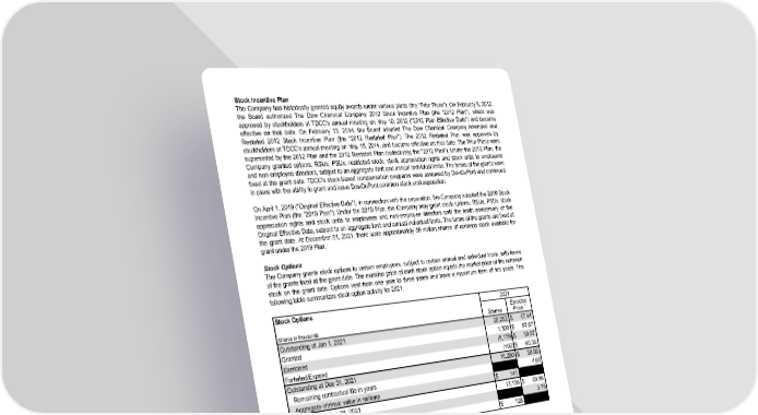 Stock Incentive Plan The Company has historically granted equity awards under various plans (the "Prior Plans"). On February 9, 2012, the Board authorized The Dow Chemical Company 2012 Stock Incentive Plan (the "2012 Plan"), which was approved by stockholders at TDCC's annual meeting on May 10, 2012 ("2012 Plan Effective Date") and became effective on that date. On February 13, 2014, the Board adopted The Dow Chemical Company Amended and Restated 2012 Stock Incentive Plan (the "2012 Restated Plan"). The 2012 Restated Plan was approved by stockholders at TDCC's annual meeting on May 15, 2014, and became effective on that date. The Prior Plans were superseded by the 2012 Plan and the 2012 Restated Plan (collectively, the "2012 Plan"). Under the 2012 Plan, the Company granted options, RSUs, PSUs, restricted stock, stock appreciation rights and stock units to employees and non-employee directors, subject to an aggregate limit and annual individual limits. The terms of the grants were fixed at the grant date. TDCC's stock-based compensation programs were assumed by DowDuPont and continued in place with the ability to grant and issue DowDuPont common stock until separation. On April 1, 2019 ("Original Effective Date"), in connection with the separation, the Company adopted the 2019 Stock Incentive Plan (the "2019 Plan"). Under the 2019 Plan, the Company may grant stock options, RSUs, PSUs, stock appreciation rights and stock units to employees and non-employee directors until the tenth anniversary of the Original Effective Date, subject to an aggregate limit and annual individual limits. The terms of the grants are fixed at the grant date. At December 31, 2021 , there were approximately 59 million shares of common stock available for grant under the 2019 Plan. Stock Options The Company grants stock options to certain employees, subject to certain annual and individual limits, with terms of the grants fixed at the grant date. The exercise price of each stock option equals the market price of the common stock on the grant date. Options vest from one year to three years and have a maximum term of ten years . The following table summarizes stock option activity for 2021 : Stock Options 2021 Shares in thousands Shares Exercise Price 1 Outstanding at Jan 1, 2021 20,252 $ 47.44 Granted 1,309 $ 57.67 Exercised (5,179) $ 39.97 Forfeited/Expired (102) $ 60.36 Outstanding at Dec 31, 2021 16,280 $ 50.56 Remaining contractual life in years 4.65 Aggregate intrinsic value in millions $ 141 Exercisable at Dec 31, 2021 13,106 $ 49.96 Remaining contractual life in years 3.75 Aggregate intrinsic value in millions $ 128 1. Weighted-average per share. Additional Information about Stock Options In millions, except per share amounts 2021 2020 2019 Weighted-average fair value per share of options granted $ 10.37 $ 5.89 $ 7.99 Total compensation expense for stock option plans $ 14 $ 22 $ 23 Related tax benefit $ 3 $ 5 $ 5 Total amount of cash received from the exercise of options $ 217 $ 108 $ 93 Total intrinsic value of options exercised 1 $ 121 $ 41 $ 77 Related tax benefit $ 27 $ 9 $ 17 1. Difference between the market price at exercise and the price paid by the employee to exercise the options. Total unrecognized compensation cost related to unvested stock option awards of $5 million at December 31, 2021 , is expected to be recognized over a weighted-average period of 1.47 years. 137
