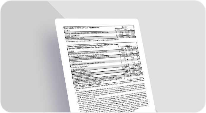 Reconciliation of Non-GAAP Cash Flow Measures Dow Inc. In millions 2021 2020 2019 Cash provided by operating activities - continuing operations (GAAP) $ 7,069 $ 6,252 $ 5,713 Capital expenditures (1,501) (1,252) (1,961) Free cash flow (non-GAAP) 1 $ 5,568 $ 5,000 $ 3,752 1. Free cash flow for the year ended December 31, 2021 reflects a $1 billion elective pension contribution. Reconciliation of Cash Flow Conversion (Operating EBITDA or Pro Forma Operating EBITDA to Cash Flow From Operations) Dow Inc. In millions 2021 2020 2019 1 Income (loss) from continuing operations, net of tax (GAAP) $ 6,405 $ 1,294 $ (1,717) + Provision for income taxes on continuing operations 1,740 777 470 Income (loss) from continuing operations before income taxes $ 8,145 $ 2,071 $ (1,247) - Interest income 55 38 81 + Interest expense and amortization of debt discount 731 827 933 + Pro forma adjustments ² — — 65 - Significant items ³ (712) 145 (4,682) Operating EBIT (non-GAAP) $ 9,533 $ 2,715 $ 4,352 + Depreciation and amortization 2,842 2,874 2,938 Operating EBITDA (non-GAAP) $ 12,375 $ 5,589 $ 7,290 Cash provided by operating activities - continuing operations (GAAP) $ 7,069 $ 6,252 $ 5,713 Cash flow conversion (Operating EBITDA or pro forma Operating EBITDA to cash flow from operations) (non-GAAP) 4 57.1 % 111.9 % 78.4 % 1. Operating EBIT, depreciation and amortization and Operating EBITDA for the year ended December 31, 2019 is presented on a pro forma basis. 2. Pro forma adjustments for the year ended December 31, 2019 include: (1) the margin impact of various manufacturing, supply and service related agreements entered into with DuPont and Corteva in connection with the separation which provide for different pricing than the historical intercompany and intracompany pricing practices of TDCC and Historical DuPont and (2) the elimination of the impact of events directly attributable to the Merger, internal reorganization and business realignment, separation, distribution and other related transactions (e.g., one-time transaction costs). 3. The year ended December 31, 2021 includes costs associated with the Company's digital acceleration program; restructuring, implementation costs and asset related charges - net; a loss on early extinguishment of debt; a gain on a previous divestiture, litigation related charges, awards and adjustments; and indemnification and other transaction related costs. The year ended December 31, 2020 includes integration and separation costs, restructuring, implementation costs and asset related charges - net, a gain on a warranty accrual adjustment of an exited business, a net gain on divestitures and asset sale, a gain related to a legal matter with Nova, a loss on early extinguishment of debt and a loss associated with agreements entered into with DuPont and Corteva as part of the separation and distribution. The year ended December 31, 2019 includes integration and separation costs, restructuring, goodwill impairment and asset related charges - net, a gain on a warranty accrual adjustment of an exited business, environmental charges, a loss related to previous divestitures, a loss on early extinguishment of debt, a net gain related to litigation matters and a loss associated with agreements entered into with DuPont and Corteva as part of the separation and distribution. See Note 26 to the Consolidated Financial Statements for additional information. 4. Cash flow conversion for the year ended December 31, 2021 reflects a $1 billion elective pension contribution. Liquidity & Financial Flexibility The Company’s primary source of incremental liquidity is cash flows from operating activities. The generation of cash from operations and the Company's ability to access capital markets is expected to meet the Company’s cash requirements for working capital, capital expenditures, debt maturities, contributions to pension plans, dividend distributions to stockholders, share repurchases and other needs. In addition to cash from operating activities, the Company’s current liquidity sources also include TDCC's U.S. and Euromarket commercial paper programs, committed and uncommitted credit facilities, committed accounts receivable facilities, a U.S. retail note program (“InterNotes®”) and other debt markets. The Company continues to maintain a strong financial position with all of its committed credit facilities undrawn and fully available at December 31, 2021 . Cash and committed and available forms of liquidity were $12.6 billion at December 31, 2021 . The Company also has no substantive long-term debt maturities due until 2026. Additional details on sources of liquidity are as follows: 51