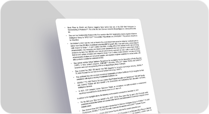 • Great Place to Work® and Fortune magazine have named Dow one of the 2021 Best Workplaces in Manufacturing & Production™. This is the first time Dow was named to this prestigious list, ranking third on the list. • Dow won two Sustainability Product of the Year awards in the 2021 Sustainability Awards program of Business Intelligence Group for SPECFLEX™ Microcellular Polyurethane and SYNTEGRA™ Polyurethane Dispersions for Microfiber. • On October 6, 2021, Dow Inc. held an Investor Day event where it announced the following: investment plans to deliver more than $3 billion of additional underlying EBITDA growth with a clear path to zero-carbon emissions (with respect to Scope 1, 2 and 3 carbon emissions, including offsets from product benefits and technology advancements); new renewable and cleaner power agreements which are expected to reduce Dow's Scope 2 emissions by more than 600,000 metric tons of carbon dioxide equivalent per year; a plan to build the world's first net-zero carbon emissions (with respect to Scope 1 and 2 carbon dioxide emissions, including technology advancements) ethylene and derivatives complex; and expansion of global capabilities for circular plastics, with initial products available for customers in 2022. • Dow earned multiple Critical Guidance Recognitions for recyclability from the Association of Plastic Recyclers ("APR"), in three product categories. ROBOND™ Adhesives, OPULUX™ Optical Finishes and SURLYN™ Ionomers were each recognized by APR for solving packaging design challenges. • Dow received two R&D 100 Awards from R&D Magazine for innovative technologies including: DOWSIL™ TC-4060 Thermal Gel and Multi-functional Sorbent Technology ("MUST"). • Five additional Dow sites received International Sustainability & Carbon Certification PLUS recognition for their compliance with rigorous tracking of sustainable feedstocks use. • DOWSIL™ TC-4060 Thermal Gel was awarded Best Product Innovation and SunSpheres™ BIO SPF Booster was awarded Product with Best Benefit to the Environment and Sustainability from Innovation Commodity Intelligence Services. • In 2021, CDP (formerly Carbon Disclosure Project, an international non-profit specialized in environmental reporting) improved Dow's climate change score to an A- from a B. In addition to the highlights above, the following events occurred subsequent to December 31, 2021 : • For the third year, Dow was named to the JUST 100 list. Dow earned the top spot in the Chemicals sector overall and received the number one position in the Workers and Stakeholders & Governance categories versus industry peers. • Dow received three 2021 BIG Innovation Awards from the Business Intelligence Group for DOWSIL™ TC-2035 CV Adhesive, DOWSIL™ TC-6015 Thermally Conductive Encapsulant and UCARE™ Extreme Polymer. • Dow was named to Bloomberg’s 2022 Gender-Equality Index for the second consecutive year. • Dow was named by the Human Rights Campaign ("HRC") Foundation to its 2022 list of “Best Places to Work for LGBTQ+ Equality.” This marks the Company’s seventeenth consecutive year receiving a perfect score on HRC’s Corporate Equality Index. RESULTS OF OPERATIONS Net Sales The following tables summarize net sales, pro forma net sales and sales variance by operating segment and geographic region from the prior year: Summary of Sales Results In millions 2021 2020 2019 Net sales $ 54,968 $ 38,542 $ 42,951 Pro forma net sales $ — $ — $ 42,998 34