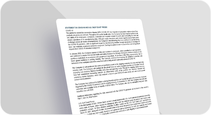 STATEMENT ON COVID-19 AND U.S. GULF COAST FREEZE COVID-19 The pandemic caused by coronavirus disease 2019 ("COVID-19") has impacted all geographic regions where Dow products are produced and sold. Throughout this public health crisis, the Company has been focused on the health and safety of its employees, contractors, customers and suppliers around the world and maintaining the safe and reliable operations of its manufacturing sites. Although supply disruptions and related logistics issues have posed challenges across all modes of transportation, the Company’s manufacturing sites have continued to operate during the COVID-19 pandemic, with no significant impact to manufacturing whether through shutdowns or shortages in labor, raw materials or personal protective equipment. Contingency plans remain in place in the event of significant impacts from COVID-19 infection resurgences. In January 2022, the Company opened all sites and locations to employees, where permitted by local regulations, and continues to require that several health and safety measures be followed. All regions continue to follow on-site workforce restrictions in accordance with government regulations. At the time of this filing, approximately half of Dow’s global workforce is working remotely. The Company continues to encourage its workforce to practice safe behaviors in the workplace and while away from work to help prevent community spread of COVID-19. The Company is well-positioned for continued profitable growth in the ongoing economic recovery and improving industry cycle. The Company will maintain its disciplined focus on capital allocation priorities as it benefits from an improving cost structure, financial flexibility and a low-cost operating model. Through the ongoing market recovery, Dow has experienced increasing margins as differentiated parts of the portfolio see improved demand and underlying market dynamics, which has enabled a return to pre-COVID-19 sales levels and end-market growth across most businesses. The Company has continued to maintain a strong financial position and liquidity throughout the economic recession triggered by the COVID-19 pandemic and its ongoing recovery. At December 31, 2021, the Company had cash and committed and available forms of liquidity of $ 12.6 billion . The Company also has no substantive long-term debt maturities due until 2026. Additional information regarding the risks associated with the COVID-19 pandemic can be found in this report in Part 1, Item 1A, Risk Factors. U.S. Gulf Coast Freeze In the first quarter of 2021, Winter Storm Uri had a broad impact on the U.S. Gulf Coast and in particular across the entire state of Texas, which resulted in widespread utility and raw material supply disruptions and industry-wide production outages. All Dow ethylene production facilities located on the U.S. Gulf Coast were operational by March 31, 2021, along with all sites. As a result of the winter storm, the product and supply chain impacts across the industry created very tight supply dynamics and generated pricing momentum for both raw materials and finished goods. The Company remains close to its customers and continues to work diligently to meet demand needs. 30