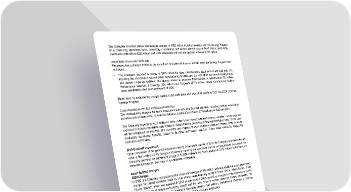 The Company recorded pretax restructuring charges of $955 million inception-to-date under the Synergy Program on a continuing operations basis, consisting of severance and related benefit costs of $647 million , asset write- downs and write-offs of $263 million and costs associated with exit and disposal activities of $45 million . Asset Write-downs and Write-offs The restructuring charges related to the write-down and write-off of assets in 2019 under the Synergy Program were as follows: • The Company recorded a charge of $143 million for other miscellaneous asset write-downs and write-offs, including the shutdown of several small manufacturing facilities and the write-off of non-manufacturing assets and certain corporate facilities. The charge related to Industrial Intermediates & Infrastructure ( $2 million ), Performance Materials & Coatings ( $28 million ) and Corporate ( $113 million ). These manufacturing facilities were substantially shut down by the end of 2020. There were no restructuring charges related to the write-down and write-off of assets in 2020 and 2021 under the Synergy Program. Costs Associated with Exit and Disposal Activities The restructuring charges for costs associated with exit and disposal activities, including contract cancellation penalties and environmental remediation liabilities, totaled $26 million in 2019 and zero in 2020 and 2021 . The Company expects to incur additional costs in the future related to its restructuring activities. Future costs are expected to include demolition costs related to closed facilities and restructuring implementation costs. These costs will be recognized as incurred. The Company also expects to incur additional employee-related costs, including involuntary termination benefits, related to its other optimization activities. These costs cannot be reasonably estimated at this time. 2019 Goodwill Impairment Upon completion of the goodwill impairment testing in the fourth quarter of 2019, the Company determined the fair value of the Coatings & Performance Monomers reporting unit was lower than its carrying amount. As a result, the Company recorded an impairment charge of $1,039 million in the fourth quarter of 2019, related to Performance Materials & Coatings. See Note 13 for additional information. Asset Related Charges 2020 Charges In 2020, the Company recognized pretax impairment charges of $49 million , including additional pretax impairment charges for capital additions made to a bio-ethanol manufacturing facility in Santa Vitoria, Minas Gerais, Brazil ("Santa Vitoria"), which was impaired in 2017 and divested in 2020, as well as charges for miscellaneous write-offs and write-downs of non-manufacturing assets and the write-down of certain corporate leased equipment. The impairment charges related to Packaging & Specialty Plastics ( $19 million ), Performance Materials & Coatings ( $15 million ) and Corporate ( $15 million ). See Note 23 for additional information. 2019 Charges On August 13, 2019, the Company entered into a definitive agreement to sell its acetone derivatives business to ALTIVIA Ketones & Additives, LLC. The transaction closed on November 1, 2019 and included the Company's acetone derivatives related inventory and production assets, located in Institute, West Virginia, in addition to the site infrastructure, land, utilities and certain railcars. The Company remains at the Institute site as a tenant. As a result of the planned transaction, the Company recognized a pretax impairment charge of $75 million in the third quarter of 2019, related to Packaging & Specialty Plastics ( $24 million ) and Corporate ( $51 million ). See Note 23 for additional information. In the fourth quarter of 2019, upon completion of an evaluation of its equity method investment in Sadara Chemical Company ("Sadara") for other-than-temporary impairment, the Company determined that its investment in Sadara was other-than-temporarily impaired and it was written down to zero. Additionally, as part of Dow's evaluation of Sadara, the Company reserved certain of its notes and accounts receivable with Sadara due to uncertainty on the timing of collection. As a result, the Company recorded a $1,755 million charge, related to Packaging & Specialty Plastics ( $370 million ), Industrial Intermediates & Infrastructure ( $1,168 million ) and Corporate ( $217 million ). See Notes 12 and 23 for additional information. 97