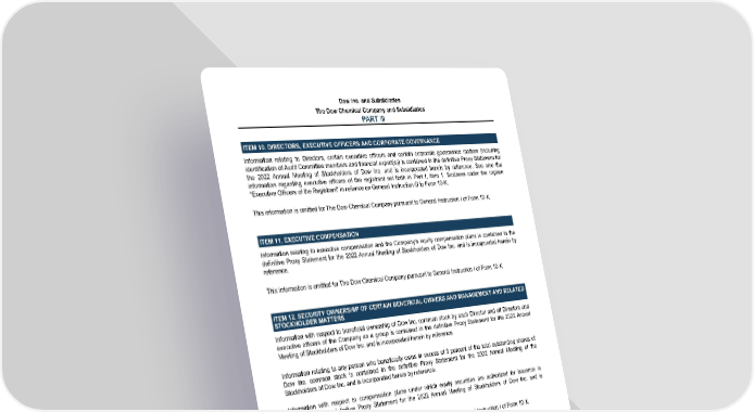 Dow Inc. and Subsidiaries The Dow Chemical Company and Subsidiaries PART III ITEM 10. DIRECTORS, EXECUTIVE OFFICERS AND CORPORATE GOVERNANCE Information relating to Directors, certain executive officers and certain corporate governance matters (including identification of Audit Committee members and financial expert(s)) is contained in the definitive Proxy Statement for the 2022 Annual Meeting of Stockholders of Dow Inc. and is incorporated herein by reference. See also the information regarding executive officers of the registrant set forth in Part I, Item 1. Business under the caption "Executive Officers of the Registrant" in reliance on General Instruction G to Form 10-K. This information is omitted for The Dow Chemical Company pursuant to General Instruction I of Form 10-K. ITEM 11. EXECUTIVE COMPENSATION Information relating to executive compensation and the Company's equity compensation plans is contained in the definitive Proxy Statement for the 2022 Annual Meeting of Stockholders of Dow Inc. and is incorporated herein by reference. This information is omitted for The Dow Chemical Company pursuant to General Instruction I of Form 10-K. ITEM 12. SECURITY OWNERSHIP OF CERTAIN BENEFICIAL OWNERS AND MANAGEMENT AND RELATED STOCKHOLDER MATTERS Information with respect to beneficial ownership of Dow Inc. common stock by each Director and all Directors and executive officers of the Company as a group is contained in the definitive Proxy Statement for the 2022 Annual Meeting of Stockholders of Dow Inc. and is incorporated herein by reference. Information relating to any person who beneficially owns in excess of 5 percent of the total outstanding shares of Dow Inc. common stock is contained in the definitive Proxy Statement for the 2022 Annual Meeting of the Stockholders of Dow Inc. and is incorporated herein by reference. Information with respect to compensation plans under which equity securities are authorized for issuance is contained in the definitive Proxy Statement for the 2022 Annual Meeting of Stockholders of Dow Inc. and is incorporated herein by reference. This information is omitted for The Dow Chemical Company pursuant to General Instruction I of Form 10-K. ITEM 13. CERTAIN RELATIONSHIPS AND RELATED TRANSACTIONS, AND DIRECTOR INDEPENDENCE Reportable relationships and related transactions, if any, as well as information relating to director independence are contained in the definitive Proxy Statement for the 2022 Annual Meeting of Stockholders of Dow Inc. and are incorporated herein by reference. This information is omitted for The Dow Chemical Company pursuant to General Instruction I of Form 10-K. 161