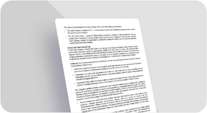 This segment also includes the Company's share of the results of the following joint ventures: • The Kuwait Styrene Company K.S.C.C. - a Kuwait-based company that manufactures styrene monomer; owned 42.5 percent by the Company. • The SCG-Dow Group - a group of Thailand-based companies (consisting of Siam Polyethylene Company Limited; Siam Polystyrene Company Limited; Siam Styrene Monomer Company Limited; and Siam Synthetic Latex Company Limited) that manufactures polyethylene, polystyrene, styrene, latex and specialty elastomers; owned 50 percent by the Company. Current and Future Investments In 2021, the Company completed the addition of a furnace to its ethylene production facility in Alberta, Canada, incrementally expanding capacity by approximately 130,000 metric tons. Dow co-invested in the expansion with a regional customer, evenly sharing project costs and ethylene output, with the additional ethylene to be consumed by existing polyethylene manufacturing assets in the region. Also, the Company completed a new catalyst production facility for key catalysts licensed by Univation Technologies, LLC, a wholly owned subsidiary of the Company. Additionally, the Company has announced investments over the next several years that are expected to enhance competitiveness. These include: • Incremental debottleneck projects across its global asset network that will deliver approximately 350 kilotonnes per annum of additional polyethylene, the majority of which will be in the U.S. & Canada. • Construction of a world-scale polyethylene unit on the U.S. Gulf Coast based on Dow’s proprietary process technologies, to meet consumer-driven demand in specialty packaging, health and hygiene, and industrial and consumer packaging applications. • Construction of the world's first net-zero carbon emissions (with respect to Scope 1 and 2 carbon dioxide (CO 2 ) emissions, including technology advancements) ethylene and derivatives complex in Alberta, Canada. The Company's ambition includes becoming the most sustainable materials science company, with a strategy to advance the well-being of humanity by helping lead the transition to a sustainable planet and society. This includes lowering energy and greenhouse gas emissions and further enabling a shift to a circular economy for plastics by focusing on resource efficiency and integrating recycled content and renewable feedstocks into its production processes. As part of that strategy, Dow announced the following in 2021: • Plans to construct the world's first net-zero carbon emissions (with respect to Scope 1 and 2 carbon dioxide emissions, including technology advancements) ethylene facility and convert the assets at its Fort Saskatchewan site in Alberta, Canada, to create the first net-zero carbon emissions complex with respect to Scope 1 and 2 carbon dioxide emissions. The project would more than triple Dow's ethylene and polyethylene capacity from its Fort Saskatchewan, Alberta site, while retrofitting the site's existing assets to net-zero carbon emissions. • Dow and Fuenix Ecogy Group expanded upon the companies' initial agreement to scale circular plastics production through advanced recycling with the construction of a second plant in Weert, The Netherlands. The new plant will process 20,000 tonnes of plastic waste into pyrolysis oil feedstocks, which will be used to produce new circular plastic at Dow's Terneuzen site in The Netherlands. • A partnership with Mura Technology ("Mura") to rapid-scale new advanced recycling solutions. The collaboration will produce circular feedstocks, which are converted into recycled plastics. Mura’s global rollout targets 1 million metric tonnes of recycling capacity by 2025. Dow will be the major off-taker of pyrolysis oil feedstocks made from Mura’s first-of-its-kind plant in Teesside, United Kingdom. • Finalization of an agreement with Gunvor Petroleum Rotterdam ("Gunvor") to purify pyrolysis oil feedstocks derived from plastic waste. Gunvor began supplying cracker-ready feedstocks to Dow in 2021, which will be used to produce circular plastics for customers. • Fast-tracking the design, engineering and construction of a market development scale purification unit in Terneuzen, The Netherlands, to provide additional capacity to purify pyrolysis oil feedstocks derived from plastic waste. • Establishment of a multi-year agreement with New Hope Energy, based in Tyler, Texas, to supply the Company with pyrolysis oil feedstocks derived from plastics recycled in North America. New Hope Energy converts used plastics into pyrolysis oil feedstocks, which Dow will use to produce circular plastics. 9