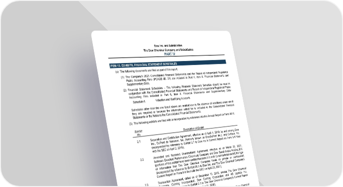 Dow Inc. and Subsidiaries The Dow Chemical Company and Subsidiaries PART IV ITEM 15. EXHIBITS, FINANCIAL STATEMENT SCHEDULES (a) The following documents are filed as part of this report: (1) The Company’s 2021 Consolidated Financial Statements and the Report of Independent Registered Public Accounting Firm (PCAOB ID: 34 ) are included in Part II, Item 8. Financial Statements and Supplementary Data. (2) Financial Statement Schedules – The following Financial Statement Schedule should be read in conjunction with the Consolidated Financial Statements and Report of Independent Registered Public Accounting Firm included in Part II, Item 8. Financial Statements and Supplementary Data: Schedule II Valuation and Qualifying Accounts Schedules other than the one listed above are omitted due to the absence of conditions under which they are required or because the information called for is included in the Consolidated Financial Statements or the Notes to the Consolidated Financial Statements. (3) The following exhibits are filed with or incorporated by reference into this Annual Report on Form 10-K: Exhibit No. Description of Exhibit 2.1 Separation and Distribution Agreement, effective as of April 1, 2019, by and among Dow Inc., DuPont de Nemours, Inc. (formerly known as DowDuPont Inc.), and Corteva, Inc. (incorporated by reference to Exhibit 2.1 to Dow Inc.'s Current Report on Form 8-K filed with the SEC on April 2, 2019). 2.2 Amended and Restated Shareholders' Agreement, effective as of March 25, 2021, between Excellent Performance Chemicals Company and Dow Saudi Arabia Holding B.V. (portions of this exhibit have been omitted because it is both (i) not material and (ii) the type of information that The Dow Chemical Company treats as private or confidential) (incorporated by reference to Exhibit 99.1 to Dow Inc. and The Dow Chemical Company's Current Report on Form 8-K filed with the SEC on April 23, 2021). 2.3 Transaction Agreement, dated as of December 10, 2015, among The Dow Chemical Company, Corning Incorporated, Dow Corning Corporation and HS Upstate Inc. (incorporated by reference to Exhibit 2.1 to The Dow Chemical Company's Current Report on Form 8-K filed with the SEC on December 11, 2015). 2.3.1 Tax Matters Agreement, dated as of December 10, 2015, among The Dow Chemical Company, Corning Incorporated, Dow Corning Corporation and HS Upstate Inc. (incorporated by reference to Exhibit 2.2 to The Dow Chemical Company's Current Report on Form 8-K filed with the SEC on December 11, 2015). 3.1 Amended and Restated Certificate of Incorporation of Dow Inc. (incorporated by reference to Exhibit 3.1 to Dow Inc.'s Current Report on Form 8-K filed with the SEC on April 2, 2019). 3.2 Amended and Restated Bylaws of Dow Inc. (incorporated by reference to Exhibit 3.2 to Dow Inc.'s Current Report on Form 8-K filed with the SEC on April 2, 2019). 3.3 Amended and Restated Certificate of Incorporation of The Dow Chemical Company (incorporated by reference to Exhibit 3.1 to The Dow Chemical Company's Current Report on Form 8-K filed with the SEC on September 1, 2017). 3.4 Amended and Restated Bylaws of The Dow Chemical Company (incorporated by reference to Exhibit 3.2 to The Dow Chemical Company's Current Report on Form 8-K filed with the SEC on September 1, 2017). 163