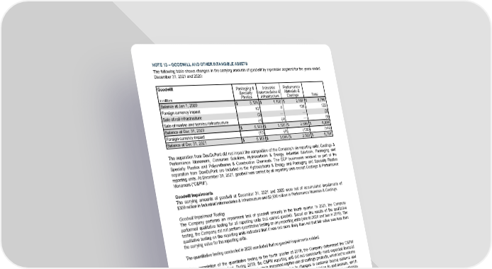 NOTE 13 – GOODWILL AND OTHER INTANGIBLE ASSETS The following table shows changes in the carrying amounts of goodwill by reportable segment for the years ended December 31, 2021 and 2020 : Goodwill Packaging & Specialty Plastics Industrial Intermediates & Infrastructure Performance Materials & Coatings Total In millions Balance at Jan 1, 2020 $ 5,109 $ 1,100 $ 2,587 $ 8,796 Foreign currency impact 12 4 106 122 Sale of rail infrastructure (2) — — (2) Sale of marine and terminal infrastructure (4) (4) — (8) Balance at Dec 31, 2020 $ 5,115 $ 1,100 $ 2,693 $ 8,908 Foreign currency impact (10) (4) (130) (144) Balance at Dec 31, 2021 $ 5,105 $ 1,096 $ 2,563 $ 8,764 The separation from DowDuPont did not impact the composition of the Company's six reporting units: Coatings & Performance Monomers, Consumer Solutions, Hydrocarbons & Energy, Industrial Solutions, Packaging and Specialty Plastics and Polyurethanes & Construction Chemicals. The ECP businesses received as part of the separation from DowDuPont are included in the Hydrocarbons & Energy and Packaging and Specialty Plastics reporting units. At December 31, 2021 , goodwill was carried by all reporting units except Coatings & Performance Monomers (“C&PM”). Goodwill Impairments The carrying amounts of goodwill at December 31, 2021 and 2020 were net of accumulated impairments of $309 million in Industrial Intermediates & Infrastructure and $2,530 million in Performance Materials & Coatings. Goodwill Impairment Testing The Company performs an impairment test of goodwill annually in the fourth quarter. In 2021 , the Company performed qualitative testing for all reporting units that carried goodwill. Based on the results of the qualitative testing, the Company did not perform quantitative testing on any reporting units ( one in 2020 and two in 2019). The qualitative testing on the reporting units indicated that it was not more likely than not that fair value was less than the carrying value for the reporting units. The quantitative testing conducted in 2020 concluded that no goodwill impairments existed. Upon completion of the quantitative testing in the fourth quarter of 2019, the Company determined the C&PM reporting unit was impaired. During 2019, the C&PM reporting unit did not consistently meet expected financial performance targets, primarily due to the industry’s increased captive use of coatings products, which led to volume reductions; reduced margins for products across the portfolio due to changes in customer buying patterns and supply and demand balances; as well as a continuous trend of customer consolidation in end-markets, which reduced growth opportunities. As a result, the C&PM reporting unit lowered its future revenue and profitability projections. The fair value of the C&PM reporting unit was determined using a discounted cash flow methodology that reflected reductions in projected revenue growth rates due to lower sales volume and price assumptions, as well as reductions to future growth rates. These discounted cash flows did not support the carrying value of the C&PM reporting unit. As a result, the Company recorded a goodwill impairment charge of $1,039 million in the fourth quarter of 2019, included in “Restructuring, goodwill impairment and asset related charges - net” in the consolidated statements of income and related to the Performance Materials & Coatings segment. The carrying value of the C&PM reporting unit's goodwill was zero at December 31, 2019. No other goodwill impairments were identified as a result of the 2019 testing. 107