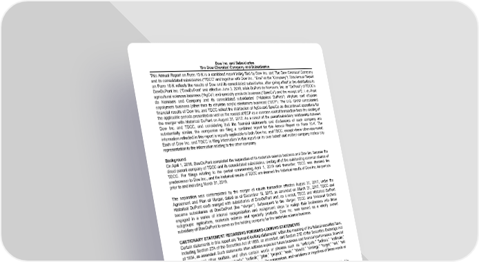 Dow Inc. and Subsidiaries The Dow Chemical Company and Subsidiaries This Annual Report on Form 10-K is a combined report being filed by Dow Inc. and The Dow Chemical Company and its consolidated subsidiaries (“TDCC” and together with Dow Inc., “Dow” or the "Company"). This Annual Report on Form 10-K reflects the results of Dow and its consolidated subsidiaries, after giving effect to the distribution to DowDuPont Inc. (“DowDuPont” and effective June 3, 2019, n/k/a DuPont de Nemours, Inc. or "DuPont") of TDCC’s agricultural sciences business (“AgCo”) and specialty products business (“SpecCo”) and the receipt of E. I. du Pont de Nemours and Company and its consolidated subsidiaries' (“Historical DuPont”) ethylene and ethylene copolymers business (other than its ethylene acrylic elastomers business) ("ECP"). The U.S. GAAP consolidated financial results of Dow Inc. and TDCC reflect the distribution of AgCo and SpecCo as discontinued operations for the applicable periods presented as well as the receipt of ECP as a common control transaction from the closing of the merger with Historical DuPont on August 31, 2017. As a result of the parent/subsidiary relationship between Dow Inc. and TDCC, and considering that the financial statements and disclosures of each company are substantially similar, the companies are filing a combined report for this Annual Report on Form 10-K. The information reflected in this report is equally applicable to both Dow Inc. and TDCC, except where otherwise noted. Each of Dow Inc. and TDCC is filing information in this report on its own behalf and neither company makes any representation to the information relating to the other company. Background On April 1, 2019, DowDuPont completed the separation of its materials science business and Dow Inc. became the direct parent company of TDCC and its consolidated subsidiaries, owning all of the outstanding common shares of TDCC. For filings relating to the period commencing April 1, 2019 and thereafter, TDCC was deemed the predecessor to Dow Inc., and the historical results of TDCC are deemed the historical results of Dow Inc. for periods prior to and including March 31, 2019. The separation was contemplated by the merger of equals transaction effective August 31, 2017, under the Agreement and Plan of Merger, dated as of December 11, 2015, as amended on March 31, 2017. TDCC and Historical DuPont each merged with subsidiaries of DowDuPont and, as a result, TDCC and Historical DuPont became subsidiaries of DowDuPont (the “Merger”). Subsequent to the Merger, TDCC and Historical DuPont engaged in a series of internal reorganization and realignment steps to realign their businesses into three subgroups: agriculture, materials science and specialty products. Dow Inc. was formed as a wholly owned subsidiary of DowDuPont to serve as the holding company for the materials science business. CAUTIONARY STATEMENT REGARDING FORWARD-LOOKING STATEMENTS Certain statements in this report are “forward-looking statements” within the meaning of the federal securities laws, including Section 27A of the Securities Act of 1933, as amended, and Section 21E of the Securities Exchange Act of 1934, as amended. Such statements often address expected future business and financial performance, financial condition, and other matters, and often contain words or phrases such as “anticipate,” “believe,” “estimate,” “expect,” “intend,” “may,” “opportunity,” “outlook,” “plan,” “project,” “seek,” “should,” “strategy,” "target," “will,” “will be,” “will continue,” “will likely result,” “would” and similar expressions, and variations or negatives of these words or phrases. Forward-looking statements are based on current assumptions and expectations of future events that are subject to risks, uncertainties and other factors that are beyond Dow’s control, which may cause actual results to differ materially from those projected, anticipated or implied in the forward-looking statements and speak only as of the date the statements were made. These factors include, but are not limited to: sales of Dow’s products; Dow’s expenses, future revenues and profitability; the continuing global and regional economic impacts of the coronavirus disease 2019 (“COVID-19”) pandemic and other public health-related risks and events on Dow’s business; capital requirements and need for and availability of financing; unexpected barriers in the development of technology, including with respect to Dow's contemplated capital and operating projects; Dow's ability to realize its commitment to carbon neutrality on the contemplated timeframe; size of the markets for Dow’s products and services and ability to compete in such markets; failure to develop and market new products and optimally manage product life cycles; the rate and degree of market acceptance of Dow’s products; significant litigation and environmental matters and related contingencies and unexpected expenses; the success of competing technologies that are or may become available; the ability to protect Dow’s intellectual property in the United States and abroad; developments related to contemplated restructuring activities and proposed divestitures or acquisitions such as workforce reduction, manufacturing facility and/or asset closure and related exit and disposal activities, and the benefits and costs associated with each of the foregoing; fluctuations in energy and raw material prices; management of process 4