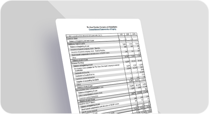 The Dow Chemical Company and Subsidiaries Consolidated Statements of Equity (In millions, except per share amounts) For the years ended Dec 31, 2021 2020 2019 Common Stock Balance at beginning and end of year $ — $ — $ — Additional Paid-in Capital Balance at beginning of year 7,603 7,333 7,042 Issuance of parent company stock - Dow Inc. 320 108 65 Issuance of parent company stock - DowDuPont Inc. — — 28 Stock-based compensation and allocation of ESOP shares 236 162 235 Other — — (37) Balance at end of year 8,159 7,603 7,333 Retained Earnings Balance at beginning of year 16,300 17,313 35,460 Net income (loss) available for The Dow Chemical Company's common stockholder 6,274 1,235 (1,237) Dividends to Dow Inc. (3,264) (2,233) (201) Dividends to DowDuPont Inc. — — (535) Common control transaction — — (16,009) Adoption of accounting standards — — (151) Other (22) (15) (14) Balance at end of year 19,288 16,300 17,313 Accumulated Other Comprehensive Loss Balance at beginning of year (10,855) (10,246) (9,885) Other comprehensive income (loss) 1,878 (609) (1,154) Common control transaction — — 793 Balance at end of year (8,977) (10,855) (10,246) Unearned ESOP Shares Balance at beginning of year (49) (91) (134) Stock-based compensation and allocation of ESOP shares 34 42 45 ESOP shares acquired — — (2) Balance at end of year (15) (49) (91) The Dow Chemical Company's stockholder's equity 18,455 12,999 14,309 Noncontrolling Interests 574 570 553 Total Equity $ 19,029 $ 13,569 $ 14,862 See Notes to the Consolidated Financial Statements. 82
