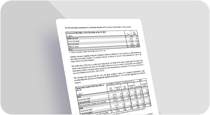 The following table summarizes the contractual maturities of the Company’s investments in debt securities: Contractual Maturities of Debt Securities at Dec 31, 2021 1 Cost Fair Value In millions Within one year $ 34 $ 37 One to five years 672 697 Six to ten years 743 743 After ten years 548 582 Total $ 1,997 $ 2,059 1. Includes marketable securities with maturities of less than one year. Portfolio managers regularly review the Company’s holdings to determine if any investments in debt securities are other-than-temporarily impaired. The analysis includes reviewing the amount of the impairment, as well as the length of time it has been impaired. The credit rating of the issuer, current credit rating trends, the trends of the issuer’s overall sector, the ability of the issuer to pay expected cash flows and the length of time the security has been in a loss position are considered in determining whether unrealized losses represent an other-than-temporary impairment. The Company did not have any credit-related losses in 2021 , 2020 or 2019 . The following table provides the fair value and gross unrealized losses of the Company’s investments in debt securities that were deemed to be temporarily impaired at December 31, 2021 and 2020 , aggregated by investment category: Temporarily Impaired Debt Securities at Dec 31 Less than 12 months 12 months or more Total Fair Value Unrealized Losses Fair Value Unrealized Losses Fair Value Unrealized Losses In millions 2021 Government debt 1 $ 295 $ (13) $ 151 $ (15) $ 446 $ (28) Corporate bonds 355 (17) 16 (3) 371 (20) Total temporarily impaired debt securities $ 650 $ (30) $ 167 $ (18) $ 817 $ (48) 2020 Government debt 1 $ 124 $ (3) $ 7 $ (7) $ 131 $ (10) Corporate bonds 55 (3) 12 (2) 67 (5) Total temporarily impaired debt securities $ 179 $ (6) $ 19 $ (9) $ 198 $ (15) 1. U.S. Treasury obligations, U.S. agency obligations, U.S. agency mortgage-backed securities and other municipalities' obligations. Equity Securities There were no material adjustments to the carrying value of the not readily determinable investments for impairment or observable price changes for the year ended December 31, 2021 . The net unrealized loss recognized in earnings on equity securities totaled $13 million for the year ended December 31, 2021 ( $32 million net unrealized gain for the year ended December 31, 2020 ). Investments in Equity Securities Dec 31, 2021 Dec 31, 2020 In millions Readily determinable fair value $ 20 $ 40 Not readily determinable fair value $ 209 $ 215 141