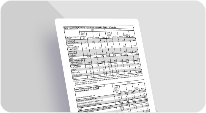 Sales Variances by Operating Segment and Geographic Region - As Reported 2021 2020 Percentage change from prior year Local Price & Product Mix Currency Volume Total Local Price & Product Mix Currency Volume Portfolio & Other 1 Total Packaging & Specialty Plastics 50 % 2 % 2 % 54 % (11) % — % 1 % — % (10) % Industrial Intermediates & Infrastructure 40 2 (2) 40 (5) — (6) — (11) Performance Materials & Coatings 19 2 1 22 (6) — (6) 1 (11) Total 40 % 2 % 1 % 43 % (7) % — % (3) % — % (10) % Total, excluding the Hydrocarbons & Energy business 37 % 2 % (2) % 37 % (5) % — % (4) % — % (9) % U.S. & Canada 42 % — % 2 % 44 % (5) % — % (8) % — % (13) % EMEAI 45 4 3 52 (12) — 1 — (11) Asia Pacific 25 2 (4) 23 (6) — — — (6) Latin America 48 — (3) 45 (7) — — — (7) Total 40 % 2 % 1 % 43 % (7) % — % (3) % — % (10) % 1. Portfolio & Other includes the sales impact of various manufacturing, supply and service related agreements entered into with DuPont and Corteva in connection with the separation, which provide for different pricing than the historical intercompany and intracompany pricing practices of TDCC and Historical DuPont. Sales Variances by Operating Segment and Geographic Region - As Reported Percentage change from prior year 2019 Local Price & Product Mix Currency Volume Portfolio & Other 1 Total Packaging & Specialty Plastics (12) % (1) % (3) % — % (16) % Industrial Intermediates & Infrastructure (12) (1) — — (13) Performance Materials & Coatings (6) (2) (3) 3 (8) Total (11) % (1) % (2) % 1 % (13) % Total, excluding the Hydrocarbons & Energy business (11) % (2) % 1 % 1 % (11) % U.S. & Canada (11) % — % (3) % 1 % (13) % EMEAI (9) (3) (4) — (16) Asia Pacific (12) (1) 5 — (8) Latin America (14) — (3) — (17) Total (11) % (1) % (2) % 1 % (13) % 1. Portfolio & Other includes the sales impact of various manufacturing, supply and service related agreements entered into with DuPont and Corteva in connection with the separation, which provide for different pricing than the historical intercompany and intracompany pricing practices of TDCC and Historical DuPont. 2021 Versus 2020 The Company reported net sales of $55 billion in 2021, up 43 percent from $38.5 billion in 2020, with local price up 40 percent, a favorable currency impact of 2 percent and volume up 1 percent. Net sales increased in all operating segments and across all geographic regions. Local price increased in all operating segments and across all geographic regions, primarily reflecting price gains due to tight supply and demand dynamics driven by logistics constraints and weather events. Local price increased in Packaging & Specialty Plastics (up 50 percent), Industrial Intermediates & Infrastructure (up 40 percent) and Performance Materials & Coatings (up 19 percent). Volume increased in Packaging & Specialty Plastics (up 2 percent) and Performance Materials & Coatings (up 1 percent). Volume decreased in Industrial Intermediates & Infrastructure (down 2 percent). Excluding the Hydrocarbons & Energy business, sales increased 37 percent. 35