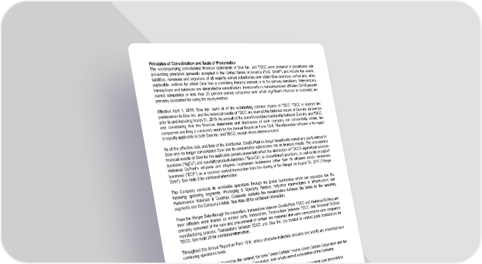 Principles of Consolidation and Basis of Presentation The accompanying consolidated financial statements of Dow Inc. and TDCC were prepared in accordance with accounting principles generally accepted in the United States of America (“U.S. GAAP”) and include the assets, liabilities, revenues and expenses of all majority-owned subsidiaries over which Dow exercises control and, when applicable, entities for which Dow has a controlling financial interest or is the primary beneficiary. Intercompany transactions and balances are eliminated in consolidation. Investments in nonconsolidated affiliates (20-50 percent owned companies or less than 20 percent owned companies over which significant influence is exercised) are primarily accounted for using the equity method. Effective April 1, 2019, Dow Inc. owns all of the outstanding common shares of TDCC. TDCC is deemed the predecessor to Dow Inc. and the historical results of TDCC are deemed the historical results of Dow Inc. for periods prior to and including March 31, 2019. As a result of the parent/subsidiary relationship between Dow Inc. and TDCC, and considering that the financial statements and disclosures of each company are substantially similar, the companies are filing a combined report for this Annual Report on Form 10-K. The information reflected in the report is equally applicable to both Dow Inc. and TDCC, except where otherwise noted. As of the effective date and time of the distribution, DowDuPont no longer beneficially owned any equity interest in Dow and no longer consolidated Dow and its consolidated subsidiaries into its financial results. The consolidated financial results of Dow for the applicable periods presented reflect the distribution of TDCC’s agricultural sciences business (“AgCo”) and specialty products business (“SpecCo”) as discontinued operations, as well as the receipt of Historical DuPont’s ethylene and ethylene copolymers businesses (other than its ethylene acrylic elastomers business) (“ECP”) as a common control transaction from the closing of the Merger on August 31, 2017 ("Merger Date"). See Note 3 for additional information. The Company conducts its worldwide operations through six global businesses which are organized into the following operating segments: Packaging & Specialty Plastics, Industrial Intermediates & Infrastructure and Performance Materials & Coatings. Corporate contains the reconciliation between the totals for the operating segments and the Company's totals. See Note 26 for additional information. From the Merger Date through the separation, transactions between DowDuPont, TDCC and Historical DuPont and their affiliates were treated as related party transactions. Transactions between TDCC and Historical DuPont primarily consisted of the sale and procurement of certain raw materials that were consumed in each company's manufacturing process. Transactions between TDCC and Dow Inc. are treated as related party transactions for TDCC. See Note 25 for additional information. Throughout this Annual Report on Form 10-K, unless otherwise indicated, amounts and activity are presented on a continuing operations basis. Except as otherwise indicated by the context, the term "Union Carbide" means Union Carbide Corporation and the term "Dow Silicones" means Dow Silicones Corporation, both wholly owned subsidiaries of the Company. Certain reclassifications of prior period amounts have been made to conform with the current year presentation. Use of Estimates in Financial Statement Preparation The preparation of financial statements in accordance with U.S. GAAP requires the use of estimates and assumptions that affect the reported amounts of assets and liabilities, the disclosure of contingent assets and liabilities at the date of the financial statements, and the reported amounts of revenues and expenses during the reporting period. The Company’s consolidated financial statements include amounts that are based on management’s best estimates and judgments. Actual results could differ from those estimates. Significant Accounting Policies Asbestos-Related Matters Accruals for asbestos-related matters, including defense and processing costs, are recorded based on an analysis of claim and resolution activity, defense spending, and pending and future claims. These accruals are assessed at each balance sheet date to determine if the asbestos-related liability remains appropriate. Accruals for asbestos- related matters are included in the consolidated balance sheets in “Accrued and other current liabilities” and “Asbestos-related liabilities - noncurrent.” See Note 16 for additional information. 84
