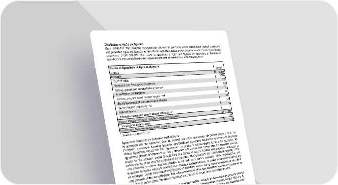 Distribution of AgCo and SpecCo Upon distribution, the Company retrospectively adjusted the previously issued consolidated financial statements and presented AgCo and SpecCo as discontinued operations based on the guidance in ASC 205-20 “Discontinued Operations” (“ASC 205-20”). The results of operations of AgCo and SpecCo are presented as discontinued operations in the consolidated statements of income and are summarized in the following table: Results of Operations of AgCo and SpecCo 2019 1 In millions Net sales $ 2,953 Cost of sales 1,804 Research and development expenses 175 Selling, general and administrative expenses 262 Amortization of intangibles 61 Restructuring and asset related charges - net 78 Equity in earnings of nonconsolidated affiliates 28 Sundry income (expense) - net (18) Interest income 3 Interest expense and amortization of debt discount 7 Income from discontinued operations before income taxes $ 579 Provision for income taxes 134 Income from discontinued operations, net of tax $ 445 1. Results through March 31, 2019. Agreements Related to the Separation and Distribution In connection with the separation, Dow Inc. entered into certain agreements with DuPont and/or Corteva, Inc. ("Corteva"), including the following: Separation and Distribution Agreement, Tax Matters Agreement and Employee Matters Agreement (collectively, the "Agreements"). In addition to establishing the terms of the separation, the Agreements provide a framework for Dow’s interaction with DuPont and Corteva after the separation and also provide for the allocation among Dow, DuPont and Corteva of assets, liabilities and obligations attributable to periods prior to, at and after the completion of the separation. The Agreements also contain certain indemnity and/or cross-indemnity provisions that are intended to set forth each party’s respective rights, responsibilities and obligations for matters subject to indemnification. Except in certain instances, the parties’ indemnification obligations are uncapped. Certain indemnification obligations will be subject to reduction by insurance proceeds or other third- party proceeds of the indemnified party that reduces the amount of the loss. In addition, indemnifiable losses will be subject to, in certain cases, “de minimis” threshold amounts and, in certain cases, deductible amounts. The impacts of indemnifications and other post-separation matters relating to the Agreements are primarily reflected in the consolidated financial statements of Dow Inc. In 2019, the Company recorded pretax charges related to the Agreements of $69 million in "Sundry income (expense) - net" and $24 million in "Integration and separation costs" in the consolidated statements of income of Dow Inc., related to Corporate. At December 31, 2021 , the Company had no assets ( $77 million at December 31, 2020) included in "Other current assets" and $20 million ( $33 million at December 31, 2020) included in "Noncurrent receivables" and liabilities of $148 million ( $412 million at December 31, 2020) included in "Accrued and other current liabilities" and $39 million ( $46 million at December 31, 2020) included in "Other noncurrent obligations" in the consolidated balance sheets of Dow Inc. Any adjustments to these assets and liabilities in subsequent periods will be recorded in Dow Inc.'s results of operations. 90