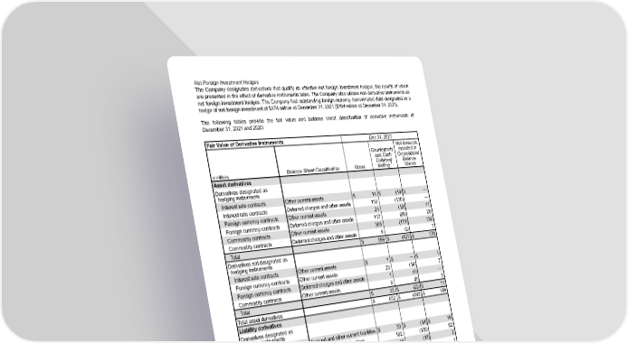 Net Foreign Investment Hedges The Company designates derivatives that qualify as effective net foreign investment hedges, the results of which are presented in the effect of derivative instruments table. The Company also utilizes non-derivative instruments as net foreign investment hedges. The Company had outstanding foreign-currency denominated debt designated as a hedge of net foreign investment of $174 million at December 31, 2021 ( $194 million at December 31, 2020 ). The following tables provide the fair value and balance sheet classification of derivative instrume n ts at December 31, 2021 and 2020 : Fair Value of Derivative Instruments Dec 31, 2021 In millions Balance Sheet Classification Gross Counterparty and Cash Collateral Netting 1 Net Amounts Included in Consolidated Balance Sheets Asset derivatives Derivatives designated as hedging instruments Interest rate contracts Other current assets $ 14 $ (14) $ — Interest rate contracts Deferred charges and other assets 130 (130) — Foreign currency contracts Other current assets 24 (13) 11 Foreign currency contracts Deferred charges and other assets 117 (89) 28 Commodity contracts Other current assets 305 (173) 132 Commodity contracts Deferred charges and other assets 9 (2) 7 Total $ 599 $ (421) $ 178 Derivatives not designated as hedging instruments Interest rate contracts Other current assets $ 1 $ — $ 1 Foreign currency contracts Other current assets 23 (16) 7 Foreign currency contracts Deferred charges and other assets 1 (1) — Commodity contracts Other current assets 8 (5) 3 Total $ 33 $ (22) $ 11 Total asset derivatives $ 632 $ (443) $ 189 Liability derivatives Derivatives designated as hedging instruments Interest rate contracts Accrued and other current liabilities $ 33 $ (14) $ 19 Interest rate contracts Other noncurrent obligations 192 (130) 62 Foreign currency contracts Accrued and other current liabilities 15 (13) 2 Foreign currency contracts Other noncurrent obligations 90 (89) 1 Commodity contracts Accrued and other current liabilities 267 (192) 75 Commodity contracts Other noncurrent obligations 2 (2) — Total $ 599 $ (440) $ 159 Derivatives not designated as hedging instruments Interest rate contracts Accrued and other current liabilities $ 59 $ — $ 59 Foreign currency contracts Accrued and other current liabilities 31 (16) 15 Foreign currency contracts Other noncurrent obligations 1 (1) — Commodity contracts Accrued and other current liabilities 25 (8) 17 Total $ 116 $ (25) $ 91 Total liability derivatives $ 715 $ (465) $ 250 1. Counterparty and cash collateral amounts represent the estimated net settlement amount when applying netting and set-off rights included in master netting arrangements between the Company and its counterparties and the payable or receivable for cash collateral held or placed with the same counterparty. 144