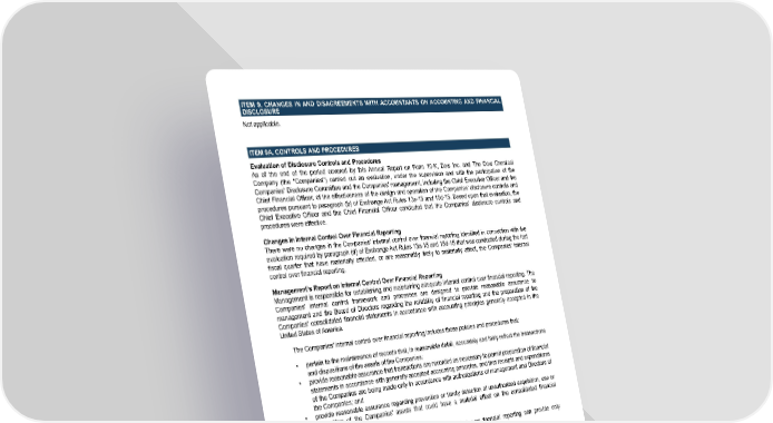 ITEM 9. CHANGES IN AND DISAGREEMENTS WITH ACCOUNTANTS ON ACCOUNTING AND FINANCIAL DISCLOSURE Not applicable. ITEM 9A. CONTROLS AND PROCEDURES Evaluation of Disclosure Controls and Procedures As of the end of the period covered by this Annual Report on Form 10-K, Dow Inc. and The Dow Chemical Company (the "Companies") carried out an evaluation, under the supervision and with the participation of the Companies' Disclosure Committee and the Companies' management, including the Chief Executive Officer and the Chief Financial Officer, of the effectiveness of the design and operation of the Companies' disclosure controls and procedures pursuant to paragraph (b) of Exchange Act Rules 13a-15 and 15d-15. Based upon that evaluation, the Chief Executive Officer and the Chief Financial Officer concluded that the Companies' disclosure controls and procedures were effective. Changes in Internal Control Over Financial Reporting There were no changes in the Companies' internal control over financial reporting identified in connection with the evaluation required by paragraph (d) of Exchange Act Rules 13a-15 and 15d-15 that was conducted during the last fiscal quarter that have materially affected, or are reasonably likely to materially affect, the Companies' internal control over financial reporting. Management’s Report on Internal Control Over Financial Reporting Management is responsible for establishing and maintaining adequate internal control over financial reporting. The Companies' internal control framework and processes are designed to provide reasonable assurance to management and the Board of Directors regarding the reliability of financial reporting and the preparation of the Companies' consolidated financial statements in accordance with accounting principles generally accepted in the United States of America. The Companies' internal control over financial reporting includes those policies and procedures that: • pertain to the maintenance of records that, in reasonable detail, accurately and fairly reflect the transactions and dispositions of the assets of the Companies; • provide reasonable assurance that transactions are recorded as necessary to permit preparation of financial statements in accordance with generally accepted accounting principles, and that receipts and expenditures of the Companies are being made only in accordance with authorizations of management and Directors of the Companies; and • provide reasonable assurance regarding prevention or timely detection of unauthorized acquisition, use or disposition of the Companies' assets that could have a material effect on the consolidated financial statements. Because of its inherent limitations, any system of internal control over financial reporting can provide only reasonable assurance and may not prevent or detect misstatements. Management assessed the effectiveness of the Companies' internal control over financial reporting and concluded that, as of December 31, 2021 , such internal control is effective. In making this assessment, management used the criteria set forth by the Committee of Sponsoring Organizations of the Treadway Commission (“COSO”) in Internal Control—Integrated Framework (2013). The Companies' independent auditors, Deloitte & Touche LLP, with direct access to the Companies' Board of Directors through the Audit Committee of Dow Inc., have audited the consolidated financial statements prepared by the Companies. Their reports on the consolidated financial statements are included in Part II, Item 8. Financial Statements and Supplementary Data. Deloitte & Touche LLP’s reports on the Companies' internal control over financial reporting are referenced therein and included herein. 157