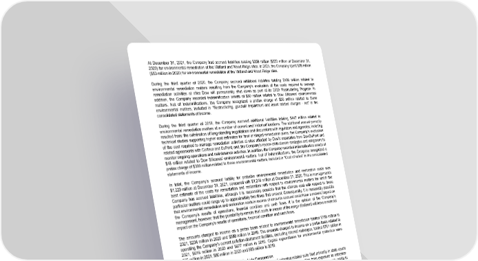 At December 31, 2021 , the Company had accrued liabilities totaling $358 million ( $370 million at December 31, 2020 ) for environmental remediation at the Midland and Wood-Ridge sites. In 2021 , the Company spent $38 million ( $53 million in 2020 ) for environmental remediation at the Midland and Wood-Ridge sites. During the third quarter of 2020, the Company accrued additional liabilities totaling $106 million related to environmental remediation matters resulting from the Company's evaluation of the costs required to manage remediation activities at sites Dow will permanently shut down as part of its 2020 Restructuring Program. In addition, the Company recorded indemnification assets of $50 million related to Dow Silicones' environmental matters. Net of indemnifications, the Company recognized a pretax charge of $56 million related to these environmental matters, included in "Restructuring, goodwill impairment and asset related charges - net" in the consolidated statements of income. During the third quarter of 2019, the Company accrued additional liabilities totaling $447 million related to environmental remediation matters at a number of current and historical locations. The additional accrual primarily resulted from: the culmination of long-standing negotiations and discussions with regulators and agencies, including technical studies supporting higher cost estimates for final or staged remediation plans; the Company’s evaluation of the cost required to manage remediation activities at sites affected by Dow’s separation from DowDuPont and related agreements with Corteva and DuPont; and, the Company’s review of its closure strategies and obligations to monitor ongoing operations and maintenance activities. In addition, the Company recorded indemnification assets of $48 million related to Dow Silicones’ environmental matters. Net of indemnifications, the Company recognized a pretax charge of $399 million related to these environmental matters, included in “Cost of sales” in the consolidated statements of income. In total, the Company’s accrued liability for probable environmental remediation and restoration costs was $1,220 million at December 31, 2021 , compared with $1,244 million at December 31, 2020 . This is management’s best estimate of the costs for remediation and restoration with respect to environmental matters for which the Company has accrued liabilities, although it is reasonably possible that the ultimate cost with respect to these particular matters could range up to approximately two times that amount. Consequently, it is reasonably possible that environmental remediation and restoration costs in excess of amounts accrued could have a material impact on the Company’s results of operations, financial condition and cash flows. It is the opinion of the Company’s management, however, that the possibility is remote that costs in excess of the range disclosed will have a material impact on the Company’s results of operations, financial condition and cash flows. The amounts charged to income on a pretax basis related to environmental remediation totaled $158 million in 2021 , $234 million in 2020 and $588 million in 2019 . The amounts charged to income on a pretax basis related to operating the Company's current pollution abatement facilities, excluding internal recharges, totaled $761 million in 2021 , $616 million in 2020 and $677 million in 2019 . Capital expenditures for environmental protection were $65 million in 2021 , $80 million in 2020 and $83 million in 2019 . Asbestos-Related Matters of Union Carbide Corporation Union Carbide is and has been involved in a large number of asbestos-related suits filed primarily in state courts during the past four decades. These suits principally allege personal injury resulting from exposure to asbestos- containing products and frequently seek both actual and punitive damages. The alleged claims primarily relate to products that Union Carbide sold in the past, alleged exposure to asbestos-containing products located on Union Carbide’s premises, and Union Carbide’s responsibility for asbestos suits filed against a former Union Carbide subsidiary, Amchem. In many cases, plaintiffs are unable to demonstrate that they have suffered any compensable loss as a result of such exposure, or that injuries incurred in fact resulted from exposure to Union Carbide’s products. 66