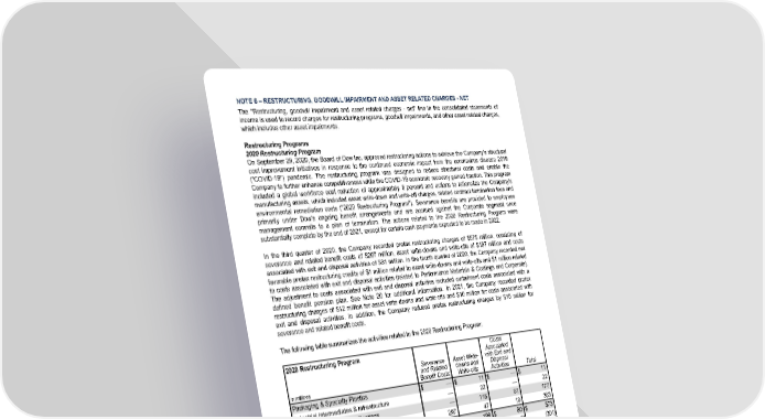 NOTE 6 – RESTRUCTURING, GOODWILL IMPAIRMENT AND ASSET RELATED CHARGES - NET The "Restructuring, goodwill impairment and asset related charges - net" line in the consolidated statements of income is used to record charges for restructuring programs, goodwill impairments, and other asset related charges, which includes other asset impairments. Restructuring Programs 2020 Restructuring Program On September 29, 2020, the Board of Dow Inc. approved restructuring actions to achieve the Company's structural cost improvement initiatives in response to the continued economic impact from the coronavirus disease 2019 ("COVID-19") pandemic. The restructuring program was designed to reduce structural costs and enable the Company to further enhance competitiveness while the COVID-19 economic recovery gained traction. This program included a global workforce cost reduction of approximately 6 percent and actions to rationalize the Company's manufacturing assets, which included asset write-down and write-off charges, related contract termination fees and environmental remediation costs ("2020 Restructuring Program"). Severance benefits are provided to employees primarily under Dow's ongoing benefit arrangements and are accrued against the Corporate segment once management commits to a plan of termination. The actions related to the 2020 Restructuring Program were substantially complete by the end of 2021, except for certain cash payments expected to be made in 2022. In the third quarter of 2020, the Company recorded pretax restructuring charges of $575 million , consisting of severance and related benefit costs of $297 million , asset write-downs and write-offs of $197 million and costs associated with exit and disposal activities of $81 million . In the fourth quarter of 2020, the Company recorded net favorable pretax restructuring credits of $1 million related to asset write-downs and write-offs and $1 million related to costs associated with exit and disposal activities (related to Performance Materials & Coatings and Corporate). The adjustment to costs associated with exit and disposal activities included curtailment costs associated with a defined benefit pension plan. See Note 20 for additional information. In 2021, the Company recorded pretax restructuring charges of $12 million for asset write-downs and write-offs and $10 million for costs associated with exit and disposal activities. In addition, the Company reduced pretax restructuring charges by $10 million for severance and related benefit costs. The following table summarizes the activities related to the 2020 Restructuring Program: 2020 Restructuring Program Severance and Related Benefit Costs Asset Write- downs and Write-offs Costs Associated with Exit and Disposal Activities Total In millions Packaging & Specialty Plastics $ — $ 11 $ — $ 11 Industrial Intermediates & Infrastructure — 22 — 22 Performance Materials & Coatings — 116 61 177 Corporate 297 47 19 363 Total restructuring charges $ 297 $ 196 $ 80 $ 573 Charges against the reserve — (196) (5) (201) Cash payments (8) — — (8) Reserve balance at Dec 31, 2020 $ 289 $ — $ 75 $ 364 Packaging & Specialty Plastics $ — $ — $ 8 $ 8 Industrial Intermediates & Infrastructure — 1 — 1 Performance Materials & Coatings — 8 2 10 Corporate (10) 3 — (7) Total restructuring charges $ (10) $ 12 $ 10 $ 12 Charges against the reserve — (12) — (12) Cash payments (175) — (21) (196) Reserve balance at Dec 31, 2021 $ 104 $ — $ 64 $ 168 At December 31, 2021 , $112 million ( $227 million at December 31, 2020 ) of the reserve balance was included in "Accrued and other current liabilities" and $56 million ( $137 million at December 31, 2020 ) was included in "Other noncurrent obligations" in the consolidated balance sheets. 95