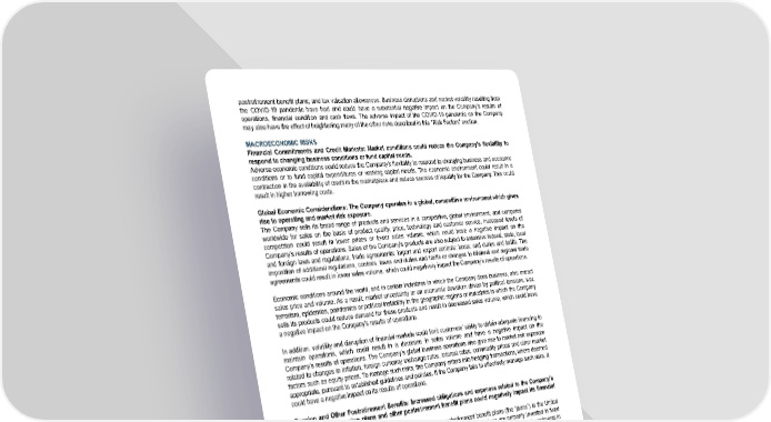 postretirement benefit plans; and tax valuation allowances. Business disruptions and market volatility resulting from the COVID-19 pandemic have had and could have a substantial negative impact on the Company’s results of operations, financial condition and cash flows. The adverse impact of the COVID-19 pandemic on the Company may also have the effect of heightening many of the other risks described in this "Risk Factors" section. MACROECONOMIC RISKS Financial Commitments and Credit Markets: Market conditions could reduce the Company's flexibility to respond to changing business conditions or fund capital needs. Adverse economic conditions could reduce the Company’s flexibility to respond to changing business and economic conditions or to fund capital expenditures or working capital needs. The economic environment could result in a contraction in the availability of credit in the marketplace and reduce sources of liquidity for the Company. This could result in higher borrowing costs. Global Economic Considerations: The Company operates in a global, competitive environment which gives rise to operating and market risk exposure. The Company sells its broad range of products and services in a competitive, global environment, and competes worldwide for sales on the basis of product quality, price, technology and customer service. Increased levels of competition could result in lower prices or lower sales volume, which could have a negative impact on the Company’s results of operations. Sales of the Company's products are also subject to extensive federal, state, local and foreign laws and regulations; trade agreements; import and export controls; taxes; and duties and tariffs. The imposition of additional regulations, controls, taxes and duties and tariffs or changes to bilateral and regional trade agreements could result in lower sales volume, which could negatively impact the Company’s results of operations. Economic conditions around the world, and in certain industries in which the Company does business, also impact sales price and volume. As a result, market uncertainty or an economic downturn driven by political tensions, war, terrorism, epidemics, pandemics or political instability in the geographic regions or industries in which the Company sells its products could reduce demand for these products and result in decreased sales volume, which could have a negative impact on the Company’s results of operations. In addition, volatility and disruption of financial markets could limit customers’ ability to obtain adequate financing to maintain operations, which could result in a decrease in sales volume and have a negative impact on the Company’s results of operations. The Company’s global business operations also give rise to market risk exposure related to changes in inflation, foreign currency exchange rates, interest rates, commodity prices and other market factors such as equity prices. To manage such risks, the Company enters into hedging transactions, where deemed appropriate, pursuant to established guidelines and policies. If the Company fails to effectively manage such risks, it could have a negative impact on its results of operations. Pension and Other Postretirement Benefits: Increased obligations and expenses related to the Company's defined benefit pension plans and other postretirement benefit plans could negatively impact its financial condition and results of operations. The Company has defined benefit pension plans and other postretirement benefit plans (the “plans”) in the United States and a number of other countries. The assets of the Company's funded plans are primarily invested in fixed income securities, equity securities of U.S. and foreign issuers and alternative investments, including investments in real estate, private equity and absolute return strategies. Changes in the market value of plan assets, investment returns, discount rates, mortality rates, regulations and the rate of increase in compensation levels may affect the funded status of the Company's plans and could cause volatility in the net periodic benefit cost, future funding requirements of the plans and the funded status of the plans. A significant increase in the Company's obligations or future funding requirements could have a negative impact on the Company's results of operations and cash flows for a particular period and on the Company's financial condition. Supply/Demand Balance: Earnings generated by the Company's products vary based in part on the balance of supply relative to demand within the industry. The balance of supply relative to demand within the industry may be significantly impacted by the addition of new capacity, especially for basic commodities where capacity is generally added in large increments as world-scale facilities are built. This may disrupt industry balances and result in downward pressure on prices due to the increase in supply, which could negatively impact the Company’s results of operations. 22