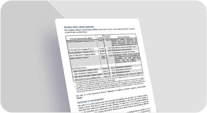 PRINCIPAL PARTLY OWNED COMPANIES The Company’s principal nonconsolidated affiliates at December 31, 2021 , including direct and indirect ownership interest for each, are listed below: Principal Nonconsolidated Affiliate Country Ownership Interest Business Description EQUATE Petrochemical Company K.S.C.C. Kuwait 42.50 % Manufactures ethylene, polyethylene and ethylene glycol, and manufactures and markets monoethylene glycol, diethylene glycol and polyethylene terephthalate resins The Kuwait Olefins Company K.S.C.C. Kuwait 42.50 % Manufactures ethylene and ethylene glycol The Kuwait Styrene Company K.S.C.C. Kuwait 42.50 % Manufactures styrene monomer Map Ta Phut Olefins Company Limited 1 Thailand 32.77 % Manufactures propylene and ethylene Sadara Chemical Company 2 Saudi Arabia 35.00 % Manufactures chlorine, ethylene, propylene and aromatics for internal consumption and manufactures and sells polyethylene, ethylene oxide and propylene oxide derivative products, and isocyanates The SCG-Dow Group: Siam Polyethylene Company Limited Thailand 50.00 % Manufactures polyethylene Siam Polystyrene Company Limited Thailand 50.00 % Manufactures polystyrene Siam Styrene Monomer Company Limited Thailand 50.00 % Manufactures styrene Siam Synthetic Latex Company Limited Thailand 50.00 % Manufactures latex and specialty elastomers 1. The Company's effective ownership of Map Ta Phut is 32.77 percent, of which the Company directly owns 20.27 percent and indirectly owns 12.5 percent through its equity interest in Siam Polyethylene Company Limited. 2. The Company is responsible for marketing the majority of Sadara products outside of the Middle East zone through the Company's established sales channels. Under this arrangement, the Company purchases and sells Sadara products for a marketing fee. In March 2021, Dow and the Saudi Arabian Oil Company agreed to transition the marketing rights and responsibilities for Sadara’s finished products to levels more consistent with each partner’s equity ownership. This transition began in July 2021 and is being implemented over the next five years. See Note 12 to the Consolidated Financial Statements for additional information regarding nonconsolidated affiliates. PROTECTION OF THE ENVIRONMENT The world is at a critical juncture and needs environmental leadership from all sectors. As a leading materials science company, Dow believes it has the responsibility and opportunity to take action and lead the industry in areas that Dow's science and expertise can make a difference. For that reason, Dow has integrated sustainability across its businesses and is collaborating across the globe to make inroads in the transition to a sustainable economy and society. The Company has identified three focus areas where it believes Dow is making a difference to drive industry-wide change: • Climate Protection - As both a major user of energy and producer of technologies that are essential to a low- carbon future, the Company believes it has a responsibility to act. Dow has set an ambitious target to become carbon neutral by 2050 (Scopes 1+2+3, as defined by the Greenhouse Gas Protocol, plus product benefits) while helping its customers reduce their greenhouse gas emissions by innovating lower-carbon products. • Circular Economy - As one of the world's largest producers of plastic, Dow is taking a leading role in supporting a more circular economy and ending plastic waste. Dow's "stop the waste" goal is a commitment to invest and/ or collaborate in key technologies and infrastructure to significantly increase global recycling. Dow's "close the loop" goal is a commitment to help customers redesign and promote reusable or recyclable packaging applications. • Safer Materials - As a world-leading materials science company, Dow plays a pivotal role in innovating materials that bring social and environmental value alongside business value. Dow is committed to innovating and bringing safer materials to the market by continuously evaluating and improving how the Company measures, designs, manufactures, reports, and acts on the impact of its products. Dow envisions a future where every material it brings to market is sustainable for people and the planet. To that end, Dow is innovating the sustainable materials of tomorrow by leading candid conversations about product safety and committing to the advancement of open and transparent chemistry with Dow's value chain partners, customers and the public. 16