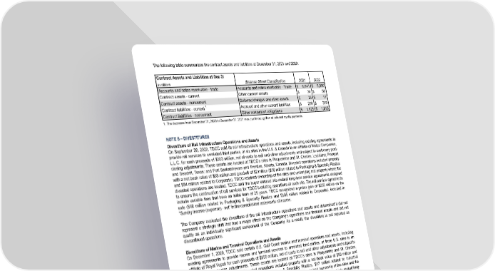 The following table summarizes the contract assets and liabilities at December 31, 2021 and 2020 : Contract Assets and Liabilities at Dec 31 Balance Sheet Classification 2021 2020 In millions Accounts and notes receivable - trade Accounts and notes receivable - Trade $ 6,841 $ 5,090 Contract assets - current Other current assets $ 34 $ 58 Contract assets - noncurrent Deferred charges and other assets $ 26 $ 11 Contract liabilities - current 1 Accrued and other current liabilities $ 209 $ 349 Contract liabilities - noncurrent Other noncurrent obligations $ 1,925 $ 1,915 1. The decrease from December 31, 2020 to December 31, 2021 was due to recognition of deferred royalty payments. N OTE 5 – DIVESTITURES Divestiture of Rail Infrastructure Operations and Assets On September 30, 2020, TDCC sold its rail infrastructure operations and assets, including existing agreements to provide rail services to unrelated third parties, at six sites in the U.S. & Canada to an affiliate of Watco Companies, L.L.C. for cash proceeds of $303 million , net of costs to sell and other adjustments and subject to customary post- closing adjustments. These assets are located at TDCC’s sites in Plaquemine and St. Charles, Louisiana; Freeport and Seadrift, Texas; and Fort Saskatchewan and Prentiss, Alberta, Canada. Divested operations included property with a net book value of $68 million and goodwill of $2 million ( $16 million related to Packaging & Specialty Plastics and $54 million related to Corporate). TDCC retained ownership of the sites and underlying real property where the divested operations are located. TDCC and the buyer entered into mutual long-term service agreements designed to ensure the continuation of rail services for TDCC's existing operations at each site. The rail-service agreements include variable fees that have an initial term of 25 years . TDCC recognized a pretax gain of $233 million on the sale ( $48 million related to Packaging & Specialty Plastics and $185 million related to Corporate), included in "Sundry income (expense) - net" in the consolidated statements of income. The Company evaluated the divestiture of the rail infrastructure operations and assets and determined it did not represent a strategic shift that had a major effect on the Company’s operations and financial results and did not qualify as an individually significant component of the Company. As a result, the divestiture is not reported as discontinued operations. Divestiture of Marine and Terminal Operations and Assets On December 1, 2020, TDCC sold certain U.S. Gulf Coast marine and terminal operations and assets, including existing agreements to provide marine and terminal services to unrelated third parties, at three U.S. sites to an affiliate of Royal Vopak for cash proceeds of $600 million , net of costs to sell and other adjustments and subject to customary post-closing adjustments. These assets are located at TDCC's sites in Plaquemine and St. Charles, Louisiana, and Freeport, Texas. Divested operations included property with a net book value of $93 million and goodwill of $8 million ( $7 million related to Packaging & Specialty Plastics, $17 million related to Industrial Intermediates & Infrastructure and $77 million related to Corporate). TDCC retained ownership of the sites and the underlying real property where the divested operations are located. TDCC and the buyer entered into mutual long- term service agreements designed to ensure the continuation of marine and terminal services for TDCC's existing operations at each site. The marine and terminal service agreements include fixed and variable fees that have initial terms of up to 25 years . In the fourth quarter of 2020, TDCC recognized a pretax gain of $499 million on the sale ( $17 million related to Packaging & Specialty Plastics, $61 million related to Industrial Intermediates & Infrastructure and $421 million related to Corporate), included in "Sundry income (expense) - net" in the consolidated statements of income. The Company evaluated the divestiture of the marine and terminal operations and assets and determined it did not represent a strategic shift that had a major effect on the Company’s operations and financial results and did not qualify as an individually significant component of the Company. As a result, the divestiture is not reported as discontinued operations. 94