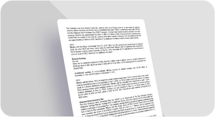 The Company may issue shares of Dow Inc. common stock out of treasury stock or as new shares of common stock for options exercised and for the release of restricted stock units ("RSUs"), performance stock units ("PSUs") and the Employee Stock Purchase Plan ("ESPP") program. Common stock shares issued to employees and non- employee directors was approximately 8.2 million in 2021 ( 4.8 million in 2020 ). Subsequent to the separation from DowDuPont, the number of new Dow Inc. common stock shares issued to employees and non-employee directors was approximately 2.5 million in 2019 . See Note 21 for additional information on the Company's equity awards. TDCC Effective with the Merger and through March 31, 2019, TDCC had 100 authorized and issued shares of common stock, par value $0.01 per share, owned solely by DowDuPont. Effective with the separation from DowDuPont, TDCC became a wholly owned subsidiary of Dow Inc., which now holds all 100 authorized and issued shares of common stock of TDCC. See Note 3 for additional information. Retained Earnings Dow Inc. There are no significant restrictions limiting Dow Inc.’s ability to pay dividends. Dow Inc. declared dividends of $2.80 per share in 2021 ( $2.80 per share in 2020 and $2.10 per share in 2019 , subsequent to the separation from DowDuPont). Undistributed earnings of nonconsolidated affiliates included in retained earnings were $1,155 million at December 31, 2021 and $716 million at December 31, 2020 . TDCC Effective with the Merger, TDCC no longer had publicly traded common stock. TDCC's common shares were owned solely by DowDuPont, prior to the separation on April 1, 2019, and TDCC's Board determined whether or not there would be a dividend distribution to DowDuPont. Effective with the separation from DowDuPont on April 1, 2019, TDCC became a wholly owned subsidiary of Dow Inc. and TDCC's Board determines whether or not there will be a dividend distribution to Dow Inc. TDCC declared and paid dividends to Dow Inc. of $3,264 million in 2021, $2,233 million in 2020 and $201 million in 2019. In 2019, TDCC declared and paid dividends to DowDuPont of $535 million . Employee Stock Ownership Plan The Dow Employee Stock Ownership Plan (the “ESOP”) is an integral part of The Dow Chemical Company Employees’ Savings Plan (the “Savings Plan”). A significant majority of full-time employees in the United States are eligible to participate in the Savings Plan. The Company uses the ESOP to provide its matching contribution in the form of stock to Plan participants. Effective with the Merger, shares of TDCC Common Stock held by the ESOP were converted into shares of DowDuPont Common Stock at a ratio of 1:1. Effective with the separation from DowDuPont, the DowDuPont Common Stock held by the ESOP received a Dow Inc. Common Stock share dividend at a ratio of 3:1, resulting in the ESOP holding both DowDuPont and Dow Inc. shares. Subsequent to the separation from DowDuPont, the ESOP independent fiduciary sold the DowDuPont shares and purchased additional Dow Inc. shares with the proceeds. In connection with the acquisition of Rohm and Haas on April 1, 2009, the Rohm and Haas Employee Stock Ownership Plan (the "Rohm and Haas ESOP") was merged into the Savings Plan, and the Company assumed the $78 million balance of debt at 9.8 percent interest with final maturity in 2020 that was used to finance share purchases by the Rohm and Haas ESOP in 1990. The debt was fully repaid in 2020 which resulted in an outstanding balance of zero at December 31, 2020 . Dividends on unallocated shares held by the ESOP are used by the ESOP to make debt service payments and to purchase additional shares if dividends exceed the debt service payments. Dividends on allocated shares are used by the ESOP to make debt service payments to the extent needed; otherwise, they are paid to the Savings Plan participants. Shares are released for allocation to participants based on the ratio of the current year’s debt service to the sum of the principal and interest payments over the life of the loan. The shares are allocated to Plan participants in accordance with the terms of the Savings Plan. The unallocated shares are excluded from the Company's earnings per share calculation. 124