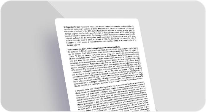 On September 15, 2020, the Canadian Federal Court of Appeal dismissed Nova's appeal of the damages judgment, thus affirming the trial court's decision in its entirety. In November 2020, Nova filed an application for leave to appeal this decision to the Court. In May 2021, the Court granted Nova's application for leave and agreed to review the damages judgment. The Court will hear oral argument on the matter in the first half of 2022 and the Company expects a decision by the end of 2022. The Company is confident of its chances to continue to defend the entire judgment, particularly the trial and appellate courts' determinations on important factual issues, which will be accorded deferential review on appeal. At December 31, 2021 , the Company had $341 million ( $341 million at December 31, 2020 ) included in "Accrued and other current liabilities" related to the disputed portion of the damages judgment. Gain Contingency - Dow v. Nova Chemicals Corporation Ethylene Asset Matter On September 18, 2019, the Court of the Queen’s Bench in Alberta, Canada, signed a judgment ordering Nova to pay the Company $1.43 billion Canadian dollars (equivalent to approximately $1.08 billion U.S. dollars) by October 11, 2019, for damages the Company incurred through 2012 related to the companies’ jointly-owned ethylene asset in Joffre, Alberta, Canada. The Court of the Queen's Bench in Alberta, Canada, which initially ruled in June 2018, found that Nova failed to operate the ethylene asset at full capacity for more than ten years, and furthermore, that Nova violated several contractual agreements related to the Company receiving its share of the asset’s ethylene production. These actions resulted in reduced productivity and sales for the Company. Nova has appealed the judgment, however, certain portions of it are not in dispute and are owed to the Company regardless of the outcome of Nova's appeal. As a result of these actions and in accordance with ASC Topic 450-30 “Gain Contingencies,” the Company recorded a $186 million pretax gain in the third quarter of 2019, of which $170 million was included in "Sundry income (expense) - net" and $16 million was included in "Selling, general and administrative expenses" in the consolidated statements of income and related to Packaging & Specialty Plastics. In October 2019, Nova paid $1.08 billion Canadian dollars (equivalent to approximately $0.8 billion U.S. dollars) directly to the Company, and remitted $347 million Canadian dollars to the Canada Revenue Agency ("CRA") for the tax account of one of the Company's subsidiaries. The Company sought a refund of the entire amount remitted to CRA. On March 31, 2020, the Company received the full refund from CRA, equivalent to $259 million U.S. dollars. In preparation for the June 2020 appellate hearing on the case, Nova provided the Court of the Queen's Bench in Alberta, Canada, an updated schedule of the financial impact of the issues on appeal, which explained that even if Nova prevails on all appeal issues, the Company would still be entitled to retain an amount in excess of the gain recognized in 2019. As a result, the Company recorded an $18 million pretax gain in the second quarter of 2020, of which $12 million was included in "Selling, general and administrative expenses" and $6 million was include d in "Sundry income (expense) - net" in the consolidated statements of income and related to Packaging & Specialty Plastics. On September 16, 2020, the Court of Appeal of Alberta issued its decision, affirming the trial court's liability finding, upholding the majority of Dow's damages and requiring the trial court to recalculate a portion of damages. In the fourth quarter of 2020, Nova chose not to petition the Court to review the appellate court decision, making additional portions of the ruling in Dow’s favor final and no longer subject to dispute. As a result, the Company recorded a $552 million pretax gain in the fourth quarter of 2020, of which $538 million was included in "Sundry income (expense) - net" and $14 million was included in "Selling, general and administrative expenses" in the consolidated statements of income and related to Packaging & Specialty Plastics. At December 31, 2021 , $323 million ( $323 million at December 31, 2020 ) was included in "Other noncurrent obligations" in the Company's consolidated balance sheets related to the disputed portion of the damages judgment. Dow continues to seek an award of additional damages for the period from 2013 through 2018. The damages hearing began in the trial court in November 2021 that would resolve the impact of the appellate ruling and quantify Dow's damages for the 2013-2018 period. Luxi Chemical Group Breach of Contract Matter In November 2017, an arbitration panel of the Stockholm Chamber of Commerce held that Luxi Chemical Group Co., Ltd. (“Luxi”), based in Shandong Province, China, violated a secrecy and non-use agreement related to the Dow and Johnson Matthey Davy Technologies Limited (“JM”) LP Oxo SM Process by using Dow and JM protected information in the design, construction, and operation of its butanol and 2-ethylhexanol plants, awarding damages, fees and costs, plus interest, to both Dow and JM. In September 2021, Luxi paid the arbitration award and interest assessment and, as a result, Dow recorded a pretax gain of $54 million included in “Sundry income (expense) – net” in the consolidated statements of income and related to Industrial Intermediates & Infrastructure. 118