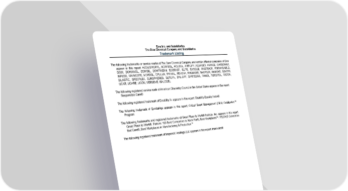 Dow Inc. and Subsidiaries The Dow Chemical Company and Subsidiaries Trademark Listing The following trademarks or service marks of The Dow Chemical Company and certain affiliated companies of Dow appear in this report: ACOUSTICRYL, ACRYSOL, ACUSOL, AMPLIFY, AQUASET, AVANSE, CARBOWAX, DOW, DOWANOL, DOWSIL, DOWTHERM, ECOFAST, ELITE, EVOQUE, FASTRACK, FORMASHIELD, INFUSE, MAINCOTE, NORDEL, OPULUX, PRIMAL, RENUVA, RHOBARR, RHOPLEX, ROBOND, SENTRY, SILASTIC, SPECFLEX, SUNSPHERES, SURLYN, SYL-OFF, SYNTEGRA, TAMOL, TERGITOL, TRITON, UCAR, UCARE, UCON, VERSENE, WALOCEL The following registered service mark of American Chemistry Council in the United States appears in this report: Responsible Care® The following registered trademark of Disability:IN appears in this report: Disability Equality Index® The following trademark of Everbridge appears in this report: Critical Event Management (CEM) Certification™ Program The following trademarks and registered trademarks of Great Place to Work® Institute, Inc. appears in this report: Great Place to Work®, Fortune 100 Best Companies to Work For®, Best Workplaces™, PEOPLE Companies that Care®, Best Workplaces in Manufacturing & Production™ The following registered trademark of InspereX Holdings LLC appears in this report: InterNotes® ® ™ Trademark of The Dow Chemical Company ("TDCC") or an affiliated company, except as otherwise specified. 169