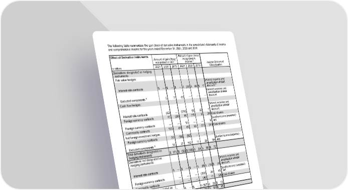 The following table summarizes the gain (loss) of derivative instruments in the consolidated statements of income and comprehensive income for the years ended December 31, 2021 , 2020 and 2019 : Effect of Derivative Instruments Amount of gain (loss) recognized in OCI 1 Amount of gain (loss) recognized in income 2 Income Statement Classification In millions 2021 2020 2019 2021 2020 2019 Derivatives designated as hedging instruments: Fair value hedges: Interest rate contracts $ — $ — $ — $ (25) $ 69 $ 17 Interest expense and amortization of debt discount 3 Excluded components 4 2 7 (3) — — — Interest expense and amortization of debt discount Cash flow hedges: Interest rate contracts (62) — (316) (9) (2) 1 Interest expense and amortization of debt discount Foreign currency contracts 13 (20) 16 (15) 3 28 Cost of sales Foreign currency contracts — — 10 — — 8 Sundry income (expense) - net Commodity contracts 133 (8) (6) 62 (31) (81) Cost of sales Net foreign investment hedges: Foreign currency contracts 31 (38) (52) — — — Excluded components 4 54 27 162 11 20 99 Sundry income (expense) - net Total derivatives designated as hedging instruments $ 171 $ (32) $ (189) $ 24 $ 59 $ 72 Derivatives not designated as hedging instruments: Interest rate contracts $ — $ — $ — $ (8) $ (16) $ (4) Interest expense and amortization of debt discount Foreign currency contracts — — — (253) 28 45 Sundry income (expense) - net Commodity contracts — — — (46) 11 (28) Cost of sales Total derivatives not designated as hedging instruments $ — $ — $ — $ (307) $ 23 $ 13 Total derivatives $ 171 $ (32) $ (189) $ (283) $ 82 $ 85 1. OCI is defined as other comprehensive income (loss). 2. Pretax amounts. 3. Gain (loss) recognized in income of derivatives is offset by gain (loss) recognized in income of the hedged item. 4. The excluded components are related to the time value of the derivatives designated as hedges. The following table provides the net after-tax amounts to be reclassified from AOCL to income within the next 12 months: Expected Reclassifications from AOCL within the next 12 months Dec 31, 2021 Cash flow hedges: Interest rate contracts $ (8) Commodity contracts $ 52 Foreign currency contracts $ 8 Net foreign investment hedges: Excluded components $ 29 146