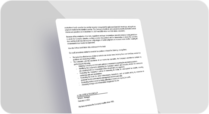 evaluation of each uncertain tax position requires management to apply specialized skill, knowledge, and significant judgment related to the identified position. The Company’s liability for unrecognized tax benefits and related accrued interest and penalties as of December 31, 2021 was $580 million and $502 million, respectively. Because of the complexity of tax laws, regulations and legal interpretations relevant to numerous taxing jurisdictions in which the Company operates, auditing uncertain tax positions and the determination of whether the more likely than not threshold was met requires a high degree of auditor judgment and increased extent of effort, including the involvement of our income tax specialists. How the Critical Audit Matter Was Addressed in the Audit Our audit procedures related to uncertain tax positions included the following, among others: • We tested the effectiveness of internal controls over income taxes, including those over identifying uncertain tax positions and measuring liabilities. • We evaluated, with the assistance of our income tax specialists, the Company’s uncertain tax positions by performing the following: – Obtaining Company and third-party opinions or memoranda regarding the uncertain tax positions. – Identifying key judgements underlying the Company’s position and evaluating whether the conclusions are consistent with our interpretation of the relevant laws and regulations. – Evaluating the Company’s method of measuring its liability for unrecognized tax benefits, including underlying data and assumptions. – Evaluating the basis for certain intercompany transactions, such as transfer pricing, by comparison to economic studies performed by management and third-party data. – Evaluating matters raised by taxing authorities in former and ongoing tax audits. – Assessing changes and interpretation of applicable tax law. /s/ DELOITTE & TOUCHE LLP Midland, Michigan February 4, 2022 We have served as the Company's auditor since 1905. 70