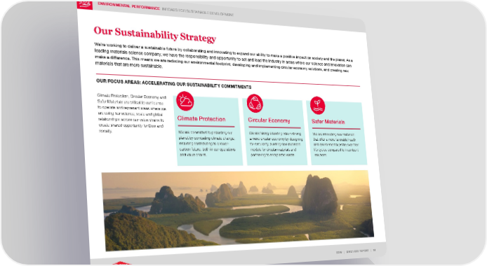 ENVIRONMENTAL PERFORMANCE INROADS FOR SUSTAINABLE DEVELOPMENT DOW | 2021 ESG REPORT | 14 Our Sustainability Strategy We’re working to deliver a sustainable future by collaborating and innovating to expand our ability to make a positive impact on society and the planet. As a leading materials science company, we have the responsibility and opportunity to act and lead the industry in areas where our science and innovation can make a difference. This means we are reducing our environmental footprint, developing and implementing circular economy solutions, and creating new materials that are more sustainable. Climate Protection, Circular Economy and Safer Materials are critical to our license to operate and represent areas where we are using our science, scale and global relationships across our value chains to create shared opportunity for Dow and society. OUR FOCUS AREAS: ACCELERATING OUR SUSTAINABILITY COMMITMENTS Safer Materials Circular Economy Climate Protection We are committed to protecting our planet by combating climate change, including contributing to a lower- carbon future, both in our operations and value chains. We are taking a leading role in driving a more circular economy by designing for circularity, building new business models for circular materials and partnering to end plastic waste. We are innovating new materials that offer a more favorable health and environmental profile over their life cycles compared to incumbent solutions.
