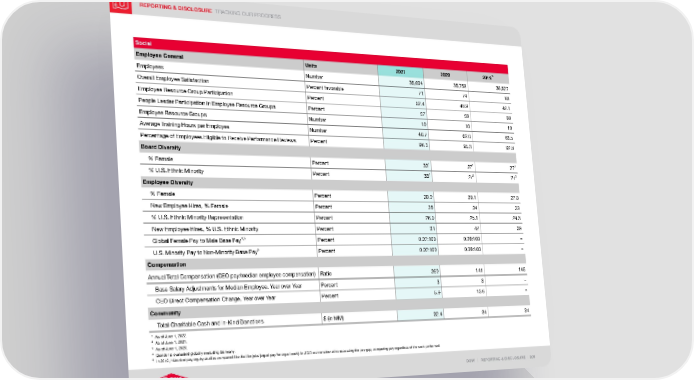 REPORTING & DISCLOSURE TRACKING OUR PROGRESS DOW | REPORTING & DISCLOSURE | 205 Social Employee General Units 2021 2020 2019 Employees Number 35,694 35,758 36,527 Overall Employee Satisfaction Percent favorable 71 74 69 Employee Resource Group Participation Percent 52.4 48.9 42.1 People Leader Participation in Employee Resource Groups Percent 97 98 88 Employee Resource Groups Number 10 10 10 Average Training Hours per Employee Number 40.7 62.0 63.5 Percentage of Employees Eligible to Receive Performance Reviews Percent 96.3 95.3 92.8 Board Diversity % Female Percent 33 1 27 2 27 3 % U.S. Ethnic Minority Percent 33 1 27 2 27 3 Employee Diversity % Female Percent 28.9 28.1 27.8 New Employee Hires, % Female Percent 35 34 33 % U.S. Ethnic Minority Representation Percent 26.0 25.1 24.3 New Employee Hires, % U.S. Ethnic Minority Percent 31 42 39 Global Female Pay to Male Base Pay 4,5 Percent 0.97:100 0.98:100 – U.S. Minority Pay to Non-Minority Base Pay 5 Percent 0.97:100 0.98:100 – Compensation Annual Total Compensation (CEO pay/median employee compensation) Ratio 260 141 145 Base Salary Adjustments for Median Employee, Year over Year Percent 3 3 – CEO Direct Compensation Change, Year over Year Percent 5.9 13.6 – Community Total Charitable Cash and In-Kind Donations $ (in MM) 32.4 34 34 1 As of June 1, 2022. 2 As of June 1, 2021. 3 As of June 1, 2020. 4 Gender is evaluated globally excluding Germany. 5 In 2019, historical pay equity studies compared like-for-like jobs (equal pay for equal work). In 2020 we transitioned to assessing the pay gap, comparing pay regardless of the work performed.