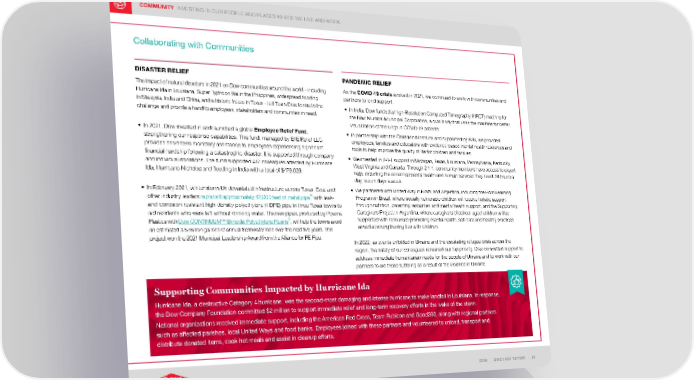 DOW | 2021 ESG REPORT | 72 COMMUNITY INVESTING IN OUR PEOPLE AND PLACES WHERE WE LIVE AND WORK Collaborating with Communities DISASTER RELIEF The impact of natural disasters in 2021 on Dow communities around the world – including Hurricane Ida in Louisiana, Super Typhoon Rai in the Philippines, widespread flooding in Malaysia, India and China, and a historic freeze in Texas – led Team Dow to rise to the challenge and provide a hand to employees, stakeholders and communities in need. • In 2021, Dow invested in and launched a global Employee Relief Fund , strengthening our response capabilities. This fund, managed by E4E Relief LLC, provides short-term monetary assistance to employees experiencing significant financial hardship following a catastrophic disaster. It is supported through company and individual donations. The fund supported 417 colleagues affected by Hurricane Ida, Hurricane Nicholas and flooding in India with a total of $479,029. • In February 2021, winter storm Uri devastated infrastructure across Texas. Dow and other industry leaders replaced approximately 42,000 feet of metal pipe with leak- and-corrosion-resistant high-density polyethylene (HDPE) pipe in three Texas towns to aid residents who were left without drinking water. The new pipes, produced by Pipeline Plastics with Dow CONTINUUM™ Bimodal Polyethylene Resins , will help the towns avoid an estimated 3.5 million gallons of annual freshwater loss over the next five years. This project won the 2021 Municipal Leadership Award from the Alliance for PE Pipe. PANDEMIC RELIEF As the COVID-19 crisis evolved in 2021, we continued to work with communities and partners to lend support. • In India, Dow funded a High-Resolution Computed Tomography (HRCT) machine for the Navi Mumbai Municipal Corporation, a civic body that uses the machine for better visualization of the lungs in COVID-19 patients. • In partnership with the Child Mind Institute and supported by WIN, we provided employees, families and educators with evidence-based mental health resources and tools to help improve the quality of life for children and families. • We invested in 2-1-1 support in Michigan, Texas, Louisiana, Pennsylvania, Kentucky, West Virginia and Canada. Through 2-1-1, community members have access to expert help, including the essential mental health and human services they need, 24 hours a day, seven days a week. • We partnered with United Way in Brazil and Argentina, including the Born Learning Program in Brazil, where socially vulnerable children will receive holistic support through nutrition, parenting resources and mental health support, and the Supporting Caregivers Project in Argentina, where caregivers of school-aged children will be supported with resources promoting mental health, self-care and healthy practices aimed at strengthening ties with children. In 2022, as events unfolded in Ukraine and the escalating refugee crisis across the region, the safety of our colleagues remained our top priority. Dow committed support to address immediate humanitarian needs for the people of Ukraine and to work with our partners to aid those suffering as a result of the violence in Ukraine. Supporting Communities Impacted by Hurricane Ida Hurricane Ida, a destructive Category 4 hurricane, was the second-most damaging and intense hurricane to make landfall in Louisiana. In response, the Dow Company Foundation committed $2 million to support immediate relief and long-term recovery efforts in the wake of the storm. National organizations received immediate support, including the American Red Cross, Team Rubicon and Good360, along with regional partners such as affected parishes, local United Ways and food banks. Employees joined with these partners and volunteered to unload, transport and distribute donated items, cook hot meals and assist in cleanup efforts.
