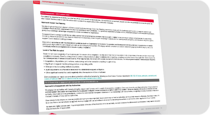 REPORTING & DISCLOSURE TRACKING OUR PROGRESS DOW | REPORTING & DISCLOSURE | 119 Dow Disclosures – GRI Content Index Our global tax organization is led by our chief tax officer, and consists of approximately 190 experienced accountants, lawyers and other tax professionals across the globe. We also commit the resources to seek the advice and counsel of tax experts around the world when necessary. Approach Toward Tax Planning Tax planning is an important element of Dow’s overall business strategy. Dow’s Tax Planning team works closely with the businesses and functions to support reasoned and compliant structures that complement the way Dow operates in each jurisdiction. Our global tax organization provides critical jurisdictional perspective into all planning decisions, giving Dow a strategic advantage compared to a more centralized tax organization. To support Dow in complying with its tax policy, advice from external service providers may be sought in relation to tax planning or complex circumstances. In cases where the tax guidance is unclear or Dow does not feel it has the necessary internal expert knowledge to assess the tax consequences adequately, external advice may be sought to support Dow’s decision-making process. Dow acts in accordance with the international guidelines (such as Organisation for Economic Co-operation and Development (OECD) guidelines) in its application of transfer pricing and aligns with the arm’s length principle on intercompany transactions. We engage outside consultants to assist in determining appropriate intercompany rates and continually review local requirements to ensure ongoing compliance. Level of Tax Risk Accepted Given the size and complexity of our business and the volume of tax obligations, tax risk arises from time to time relative to the interpretation of tax laws and the nature of our compliance measures. Dow has strong internal controls and procedures in place to minimize risk in reporting, compliance and other areas of tax application. Dow analyzes the tax consequences of transactions and events. When appropriate, we consult with outside counsel and other advisors. The following are examples of areas analyzed frequently: • Acquisitions, dispositions, joint ventures, restructurings and other transactions resulting in a gain or loss. • Significant changes in transfer pricing practices or operating profile. • Changes in tax accounting methods or policies. • Audit adjustments or unfavorable decisions in tax administrative appeals or litigation. • Other significant events that could negatively affect the reputation of Dow or its Board. Dow employees can report concerns about potential unethical tax behavior by following our Dow Code of Conduct described in GRI 102-16 Values, principles, standards, and norms of behavior and 102-17 Mechanisms for advice and concerns about ethics . 207-3 Stakeholder engagement and management of concerns related to tax Approach to Engagement with Tax Authorities We engage tax authorities with honesty, integrity, respect and fairness, and in a spirit of cooperative compliance. Dow seeks to resolve any disputed matters through proactive and transparent discussion and negotiation but is prepared to litigate or exercise alternative rights to defend our position. Where we disagree with a ruling or decision of a tax authority, Dow’s aim is to be professional, constructive and maintain transparent disclosure in our relationships with tax authorities, recognizing that early resolution of risks is in the best interests of Dow and tax authorities. Dow makes its tax returns as clear as possible and we try to raise important issues proactively so that tax authorities can focus their resources effectively. From time to time, if it is unclear how a tax law should be applied, we may engage with tax authorities in advance of undertaking transactions to confirm the correct application of such tax law. Tax laws are highly complex and, if our interpretation of the law differs from that of the tax authority, we seek to resolve the differences in a professional, timely manner or pursue dispute resolution, if appropriate.