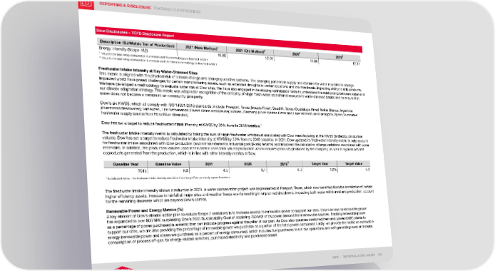 REPORTING & DISCLOSURE TRACKING OUR PROGRESS DOW | REPORTING & DISCLOSURE | 192 Dow Disclosures – TCFD Disclosure Report Description (GJ/Metric Ton of Production) 2021 (New Method) 1 2021 (Old Method) 2 2020 2 2019 Energy Intensity (Scope 1&2) 10.85 12.06 11.86 12.31 1 Value for the total energy consumption (numerator) used new methodology as described in 302-1 2 Value for the total energy consumption (numerator) used the historical methodology as described in 302-1 Freshwater Intake Intensity at Key Water-Stressed Sites This metric is aligned with the physical risk of climate change and changing weather patterns. The changing patterns in supply and demand for water in a climate change impacted world have posed challenges for certain manufacturing assets, such as extended droughts in certain locations and low river levels, impacting ability to ship products. We have developed a methodology to evaluate water risk at Dow sites. We have also engaged in developing optimization tools to understand the relationship between water and our climate adaptation strategy. This metric was adopted in recognition of the criticality of virgin fresh water as a shared resource in water-stressed basins and to ensure that water does not become a constraint on community prosperity. Dow’s six KWSS, which all comply with ISO 14001-2015 standards, include: Freeport, Texas (Brazos River); Seadrift, Texas (Guadalupe River); Bahia Blanca, Argentina (Purchased freshwater); Terneuzen, The Netherlands (Rivers Rhine and Meuse); Böhlen, Germany (River Weisse Elster and Lake Witznitz) and Tarragona, Spain (Purchased freshwater supply source from Ebro River diversion). Dow has set a target to reduce freshwater intake intensity at KWSS by 20% from its 2015 baseline. 1 The freshwater intake intensity metric is calculated by taking the sum of virgin freshwater withdrawal associated with Dow manufacturing at the KWSS divided by production volume. Dow has set a target to reduce freshwater intake intensity at KWSS by 20% from its 2015 baseline. In 2021, Dow updated its freshwater intensity metric to only account for freshwater intake associated with Dow production (and not transferred to industrial park [iPark] tenants) and improved the calculation of large variations associated with water reservoirs. In addition, the production volume used in this metric uses total valued production which includes products produced by the company, as well as byproducts and coproducts generated from the production, which is in line with other intensity metrics at Dow. Baseline Year Baseline Value 2021 2020 2019 Target Year Target Value 2015 6.6 4.5 6.1 6.7 2025 5.3 1 As indicated below – the freshwater intake intensity calculation has changed from previously reported numbers. The freshwater intake intensity shows a reduction in 2021. A water conservation project was implemented at Freeport, Texas, which also benefited from the installation of certain higher efficiency assets. Increase in rainfall at major sites and weather freeze events resulting in unplanned shutdowns, impacting both water withdrawal and production, account for the remaining decrease which are beyond Dow’s control. Renewable Power and Energy Metrics (%) A key element of Dow’s climate action plan to reduce Scope 2 emissions is to increase access to renewable power to support our sites. Dow’s access to renewable power has expanded to over 900 MW, surpassing Dow’s 2025 Sustainability Goal of obtaining 750 MW of its power demand from renewable sources. Tracking renewable power as a percentage of power purchased is a metric that can indicate progress against this pillar of our plan. As Dow also operates combined heat and power (CHP) plants to support our sites, we are also providing the percentage of renewable power we purchase as a portion of the total power consumed. Lastly, we provide the metric on renewable energy (renewable power and steam we purchase) as a percent of energy consumed, which includes fuel purchases to run our operations and self-generate power and steam, consumption of process off-gas for energy-related activities, purchased electricity and purchased steam.